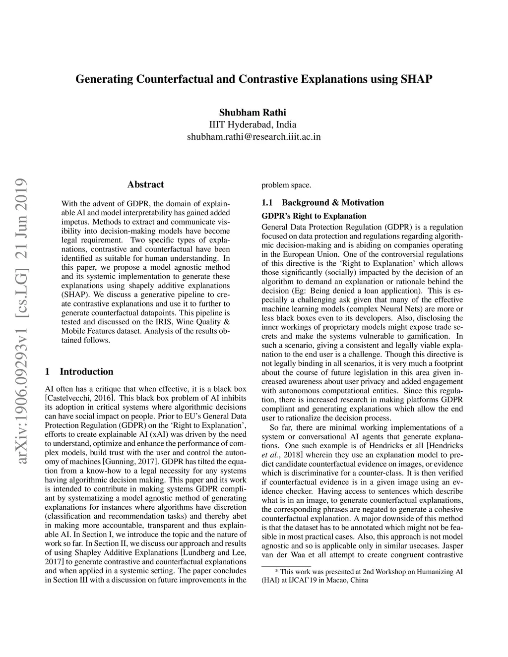 With the advent of GDPR, the domain of explainable AI and model interpretability has gained added impetus. Methods to extract and communicate visibility into decision-making models have become legal requirement. Two specific types of explanations, contrastive and counterfactual have been identified as suitable for human understanding. In this paper, we propose a model agnostic method and its systemic implementation to generate these explanations using shapely additive explanations (SHAP). We discuss a generative pipeline to create contrastive explanations and use it to further to generate counterfactual datapoints. This pipeline is tested and discussed on the IRIS, Wine Quality & Mobile Features dataset. Analysis of the results obtained follows.