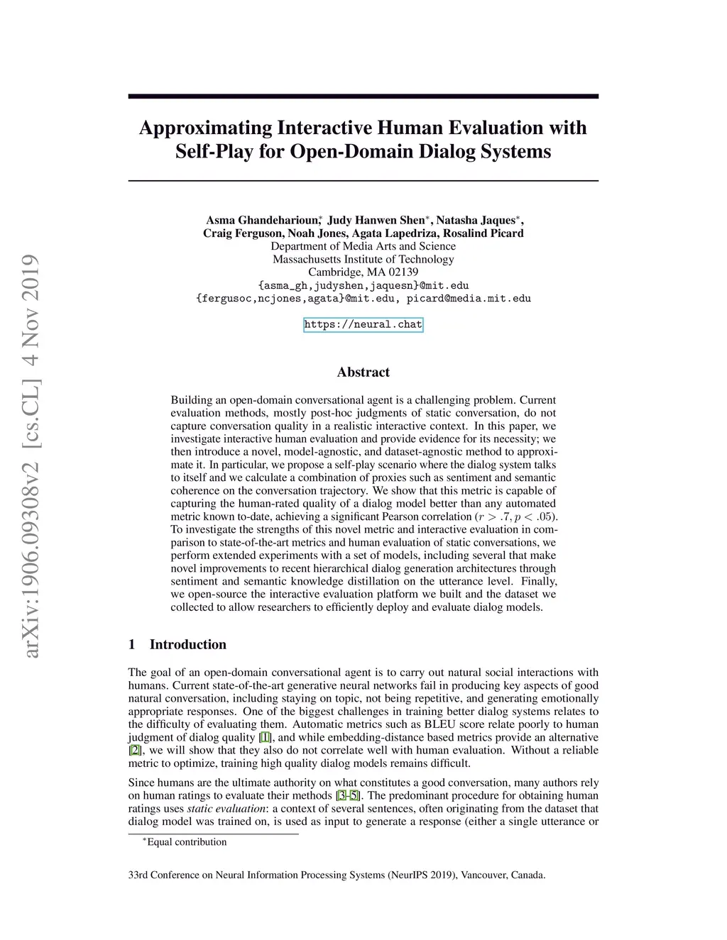 Building an open-domain conversational agent is a challenging problem. Current evaluation methods, mostly post-hoc judgments of static conversation, do not capture conversation quality in a realistic interactive context. In this paper, we investigate interactive human evaluation and provide evidence for its necessity; we then introduce a novel, model-agnostic, and dataset-agnostic method to approximate it. In particular, we propose a self-play scenario where the dialog system talks to itself and we calculate a combination of proxies such as sentiment and semantic coherence on the conversation trajectory. We show that this metric is capable of capturing the human-rated quality of a dialog model better than any automated metric known to-date, achieving a significant Pearson correlation (r>.7, p<.05). To investigate the strengths of this novel metric and interactive evaluation in comparison to state-of-the-art metrics and human evaluation of static conversations, we perform extended experiments with a set of models, including several that make novel improvements to recent hierarchical dialog generation architectures through sentiment and semantic knowledge distillation on the utterance level. Finally, we open-source the interactive evaluation platform we built and the dataset we collected to allow researchers to efficiently deploy and evaluate dialog models.