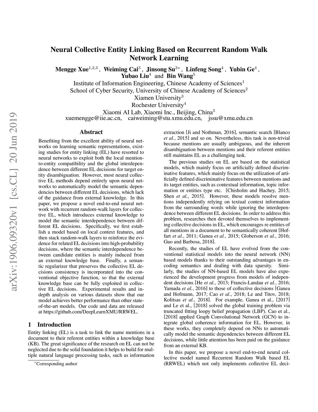 Neural Collective Entity Linking Based on Recurrent Random Walk Network