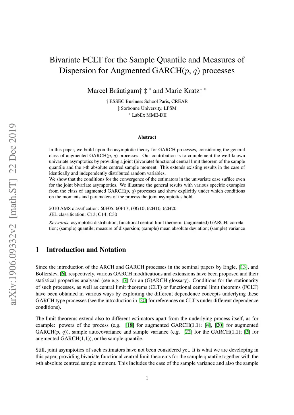 In this paper, we build upon the asymptotic theory for GARCH processes, considering the general class of augmented GARCH(, ) processes. Our contribution is to complement the well-known univariate asymptotics by providing a joint (bivariate) functional central limit theorem of the sample quantile and the r-th absolute centred sample moment. This extends existing results in the case of identically and independently distributed random variables. We show that the conditions for the convergence of the estimators in the univariate case suffice even for the joint bivariate asymptotics. We illustrate the general results with various specific examples from the class of augmented GARCH(, ) processes and show explicitly under which conditions on the moments and parameters of the process the joint asymptotics hold.