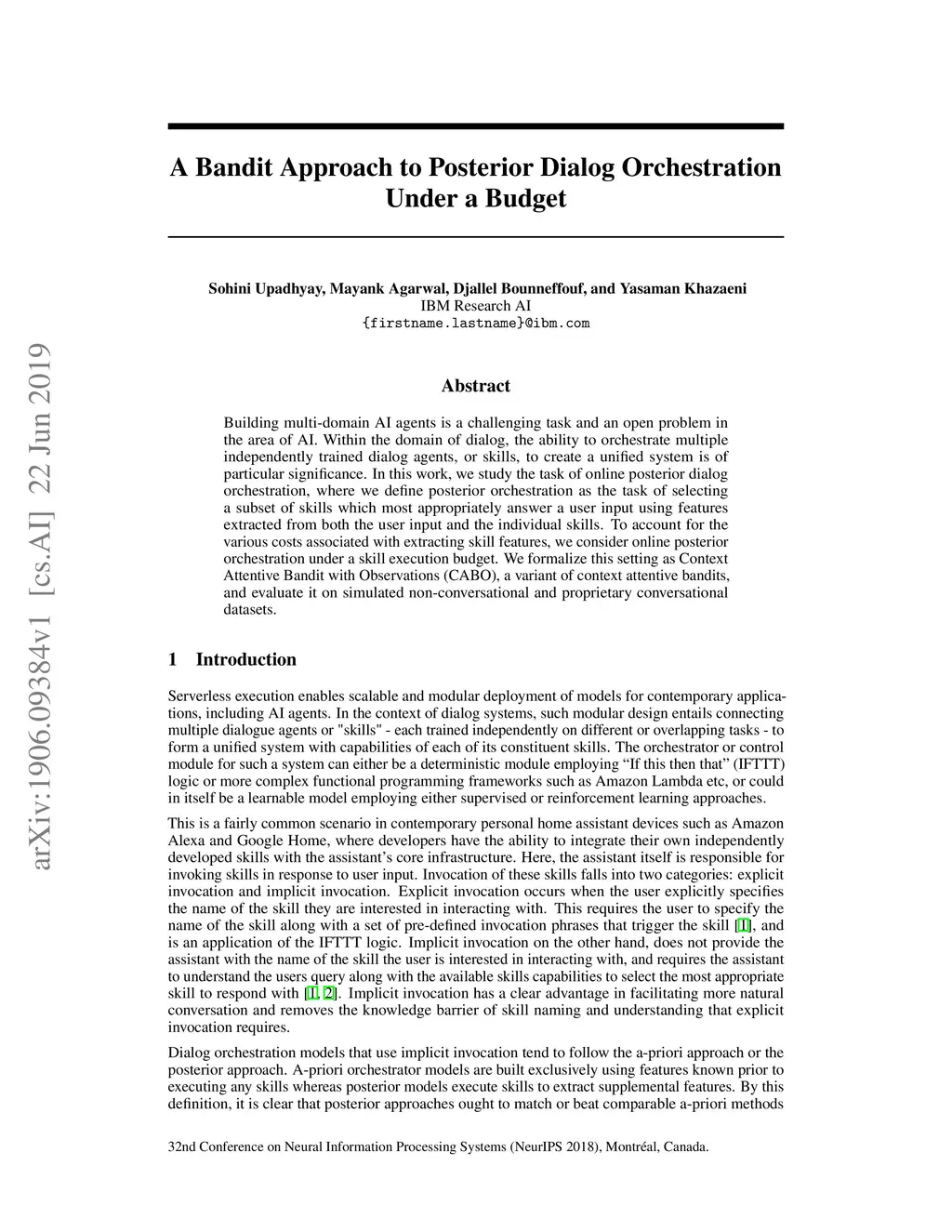 Building multi-domain AI agents is a challenging task and an open problem in the area of AI. Within the domain of dialog, the ability to orchestrate multiple independently trained dialog agents, or skills, to create a unified system is of particular significance. In this work, we study the task of online posterior dialog orchestration, where we define posterior orchestration as the task of selecting a subset of skills which most appropriately answer a user input using features extracted from both the user input and the individual skills. To account for the various costs associated with extracting skill features, we consider online posterior orchestration under a skill execution budget. We formalize this setting as Context Attentive Bandit with Observations (CABO), a variant of context attentive bandits, and evaluate it on simulated non-conversational and proprietary conversational datasets.