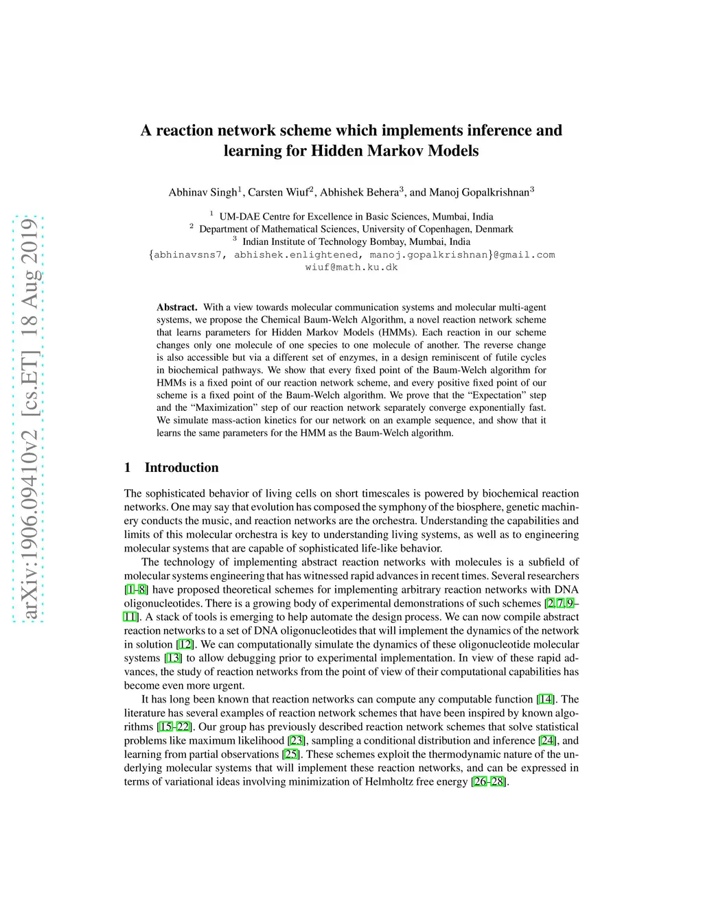 With a view towards molecular communication systems and molecular multi-agent systems, we propose the Chemical Baum-Welch Algorithm, a novel reaction network scheme that learns parameters for Hidden Markov Models (HMMs). Each reaction in our scheme changes only one molecule of one species to one molecule of another. The reverse change is also accessible but via a different set of enzymes, in a design reminiscent of futile cycles in biochemical pathways. We show that every fixed point of the Baum-Welch algorithm for HMMs is a fixed point of our reaction network scheme, and every positive fixed point of our scheme is a fixed point of the Baum-Welch algorithm. We prove that the "Expectation" step and the "Maximization" step of our reaction network separately converge exponentially fast. We simulate mass-action kinetics for our network on an example sequence, and show that it learns the same parameters for the HMM as the Baum-Welch algorithm.