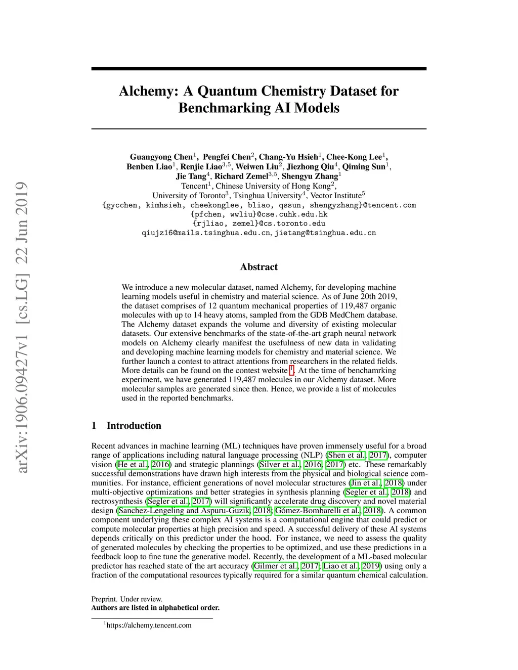 Alchemy: A Quantum Chemistry Dataset for Benchmarking AI Models