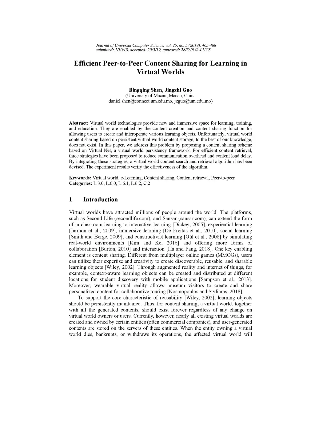 Efficient Peer-to-Peer Content Sharing for Learning in Virtual Worlds