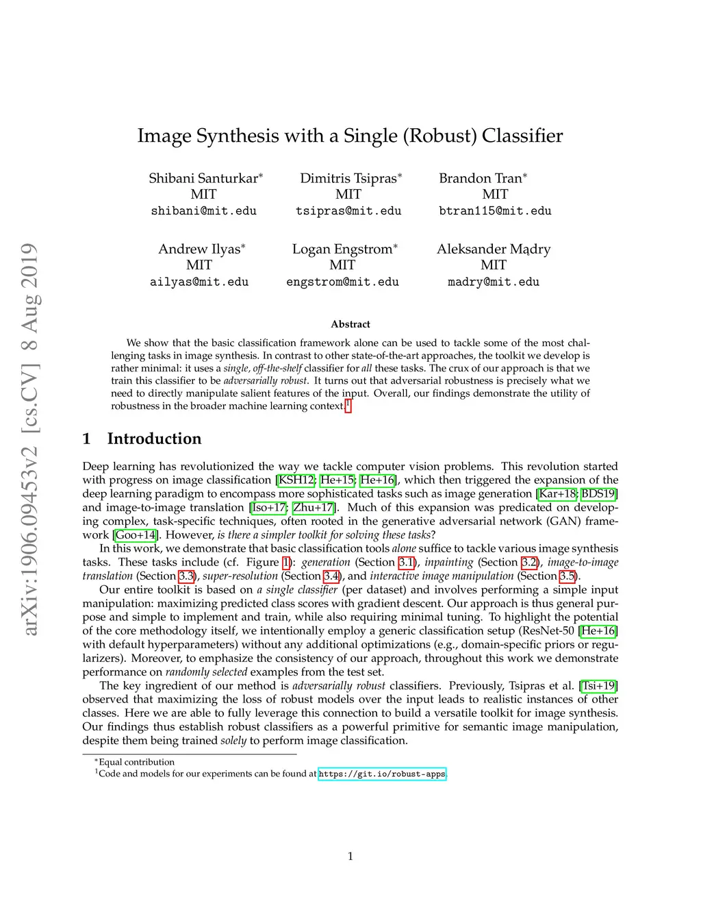 We show that the basic classification framework alone can be used to tackle some of the most challenging tasks in image synthesis. In contrast to other state-of-the-art approaches, the toolkit we develop is rather minimal: it uses a single, off-the-shelf classifier for all these tasks. The crux of our approach is that we train this classifier to be adversarially robust. It turns out that adversarial robustness is precisely what we need to directly manipulate salient features of the input. Overall, our findings demonstrate the utility of robustness in the broader machine learning context. Code and models for our experiments can be found at https://git.io/robust-apps.