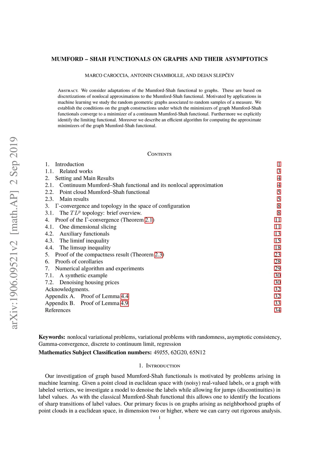 We consider adaptations of the Mumford-Shah functional to graphs. These are based on discretizations of nonlocal approximations to the Mumford-Shah functional. Motivated by applications in machine learning we study the random geometric graphs associated to random samples of a measure. We establish the conditions on the graph constructions under which the minimizers of graph Mumford-Shah functionals converge to a minimizer of a continuum Mumford-Shah functional. Furthermore we explicitly identify the limiting functional. Moreover we describe an efficient algorithm for computing the approximate minimizers of the graph Mumford-Shah functional.