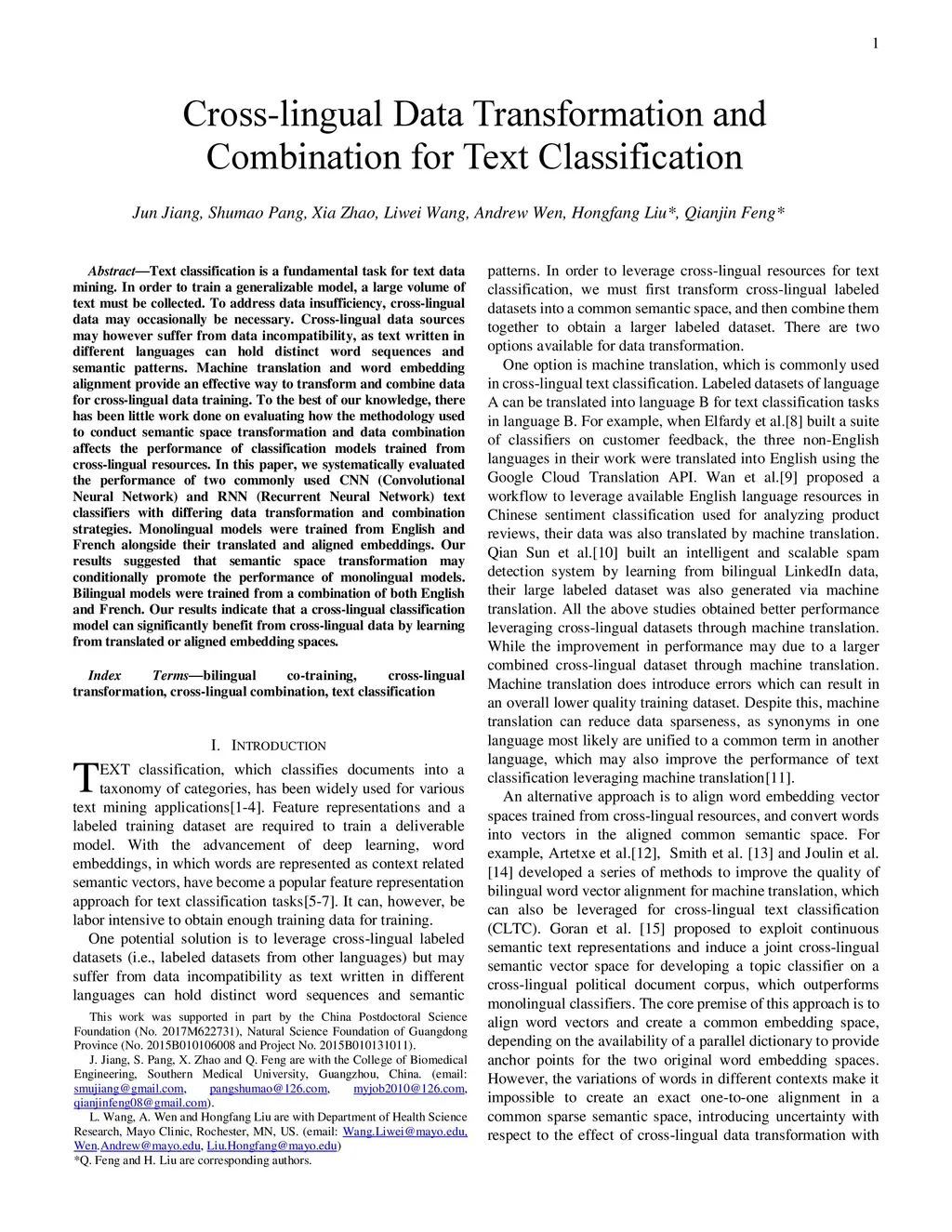 Text classification is a fundamental task for text data mining. In order to train a generalizable model, a large volume of text must be collected. To address data insufficiency, cross-lingual data may occasionally be necessary. Cross-lingual data sources may however suffer from data incompatibility, as text written in different languages can hold distinct word sequences and semantic patterns. Machine translation and word embedding alignment provide an effective way to transform and combine data for cross-lingual data training. To the best of our knowledge, there has been little work done on evaluating how the methodology used to conduct semantic space transformation and data combination affects the performance of classification models trained from cross-lingual resources. In this paper, we systematically evaluated the performance of two commonly used CNN (Convolutional Neural Network) and RNN (Recurrent Neural Network) text classifiers with differing data transformation and combination strategies. Monolingual models were trained from English and French alongside their translated and aligned embeddings. Our results suggested that semantic space transformation may conditionally promote the performance of monolingual models. Bilingual models were trained from a combination of both English and French. Our results indicate that a cross-lingual classification model can significantly benefit from cross-lingual data by learning from translated or aligned embedding spaces.