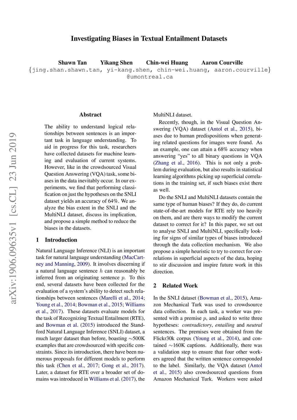 The ability to understand logical relationships between sentences is an important task in language understanding. To aid in progress for this task, researchers have collected datasets for machine learning and evaluation of current systems. However, like in the crowdsourced Visual Question Answering (VQA) task, some biases in the data inevitably occur. In our experiments, we find that performing classification on just the hypotheses on the SNLI dataset yields an accuracy of 64%. We analyze the bias extent in the SNLI and the MultiNLI dataset, discuss its implication, and propose a simple method to reduce the biases in the datasets.