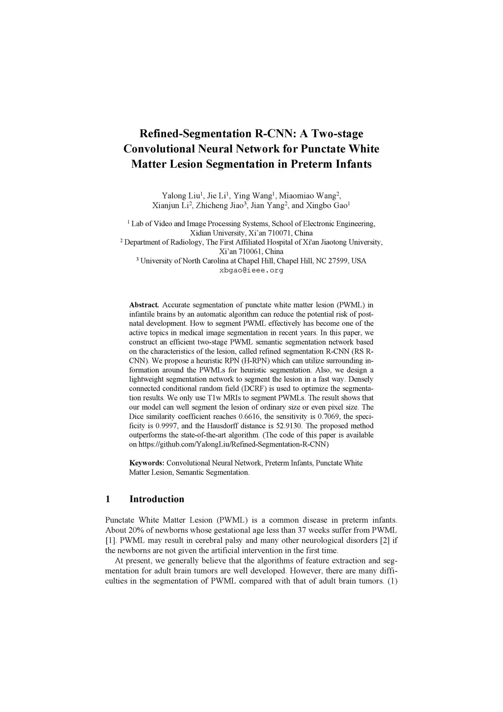Accurate segmentation of punctate white matter lesion (PWML) in infantile brains by an automatic algorithm can reduce the potential risk of postnatal development. How to segment PWML effectively has become one of the active topics in medical image segmentation in recent years. In this paper, we construct an efficient two-stage PWML semantic segmentation network based on the characteristics of the lesion, called refined segmentation R-CNN (RS RCNN). We propose a heuristic RPN (H-RPN) which can utilize surrounding information around the PWMLs for heuristic segmentation. Also, we design a lightweight segmentation network to segment the lesion in a fast way. Densely connected conditional random field (DCRF) is used to optimize the segmentation results. We only use T1w MRIs to segment PWMLs. The result shows that our model can well segment the lesion of ordinary size or even pixel size. The Dice similarity coefficient reaches 0.6616, the sensitivity is 0.7069, the specificity is 0.9997, and the Hausdorff distance is 52.9130. The proposed method outperforms the state-of-the-art algorithm. (The code of this paper is available on https://github.com/YalongLiu/Refined-Segmentation-R-CNN)