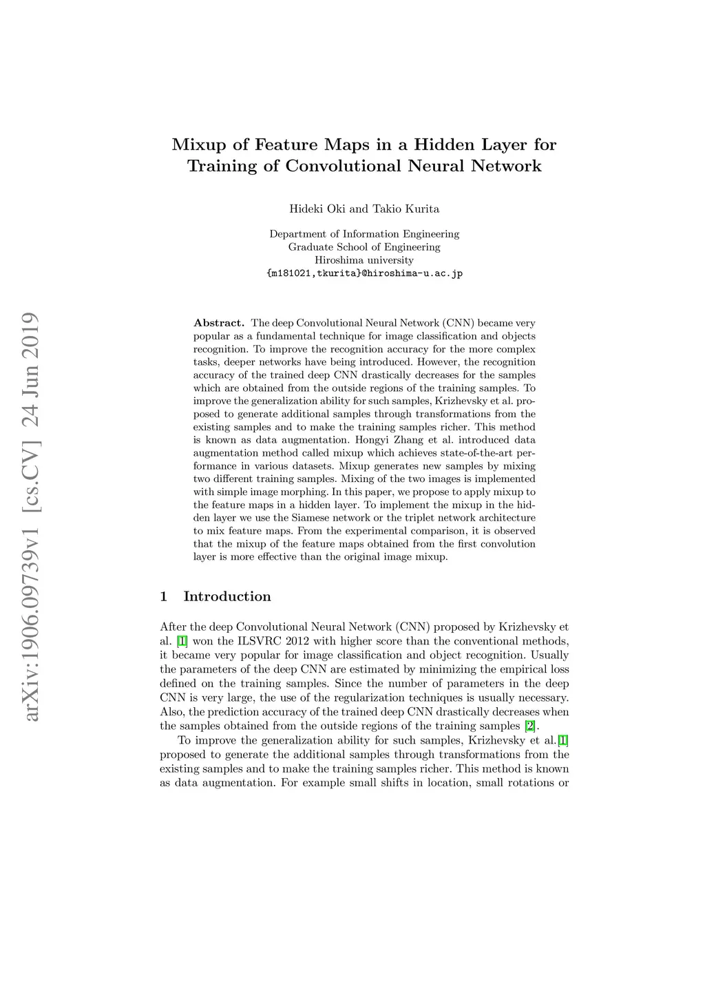 The deep Convolutional Neural Network (CNN) became very popular as a fundamental technique for image classification and objects recognition. To improve the recognition accuracy for the more complex tasks, deeper networks have being introduced. However, the recognition accuracy of the trained deep CNN drastically decreases for the samples which are obtained from the outside regions of the training samples. To improve the generalization ability for such samples, Krizhevsky et al. proposed to generate additional samples through transformations from the existing samples and to make the training samples richer. This method is known as data augmentation. Hongyi Zhang et al. introduced data augmentation method called mixup which achieves state-of-the-art performance in various datasets. Mixup generates new samples by mixing two different training samples. Mixing of the two images is implemented with simple image morphing. In this paper, we propose to apply mixup to the feature maps in a hidden layer. To implement the mixup in the hidden layer we use the Siamese network or the triplet network architecture to mix feature maps. From the experimental comparison, it is observed that the mixup of the feature maps obtained from the first convolution layer is more effective than the original image mixup.