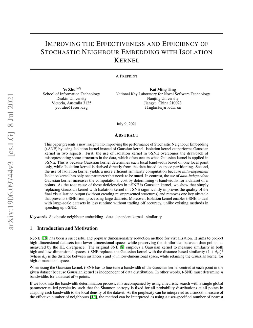 This paper presents a new insight into improving the performance of Stochastic Neighbour Embedding (t-SNE) by using Isolation kernel instead of Gaussian kernel. Isolation kernel outperforms Gaussian kernel in two aspects. First, the use of Isolation kernel in t-SNE overcomes the drawback of misrepresenting some structures in the data, which often occurs when Gaussian kernel is applied in t-SNE. This is because Gaussian kernel determines each local bandwidth based on one local point only, while Isolation kernel is derived directly from the data based on space partitioning. Second, the use of Isolation kernel yields a more efficient similarity computation because data-dependent Isolation kernel has only one parameter that needs to be tuned. In contrast, the use of data-independent Gaussian kernel increases the computational cost by determining n bandwidths for a dataset of n points. As the root cause of these deficiencies in t-SNE is Gaussian kernel, we show that simply replacing Gaussian kernel with Isolation kernel in t-SNE significantly improves the quality of the final visualisation output (without creating misrepresented structures) and removes one key obstacle that prevents t-SNE from processing large datasets. Moreover, Isolation kernel enables t-SNE to deal with large-scale datasets in less runtime without trading off accuracy, unlike existing methods in speeding up t-SNE.