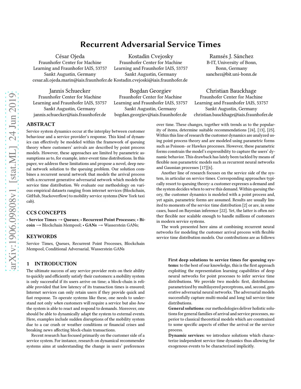 Service system dynamics occur at the interplay between customer behaviour and a service provider's response. This kind of dynamics can effectively be modeled within the framework of queuing theory where customers' arrivals are described by point process models. However, these approaches are limited by parametric assumptions as to, for example, inter-event time distributions. In this paper, we address these limitations and propose a novel, deep neural network solution to the queuing problem. Our solution combines a recurrent neural network that models the arrival process with a recurrent generative adversarial network which models the service time distribution. We evaluate our methodology on various empirical datasets ranging from internet services (Blockchain, GitHub, Stackoverflow) to mobility service systems (New York taxi cab).