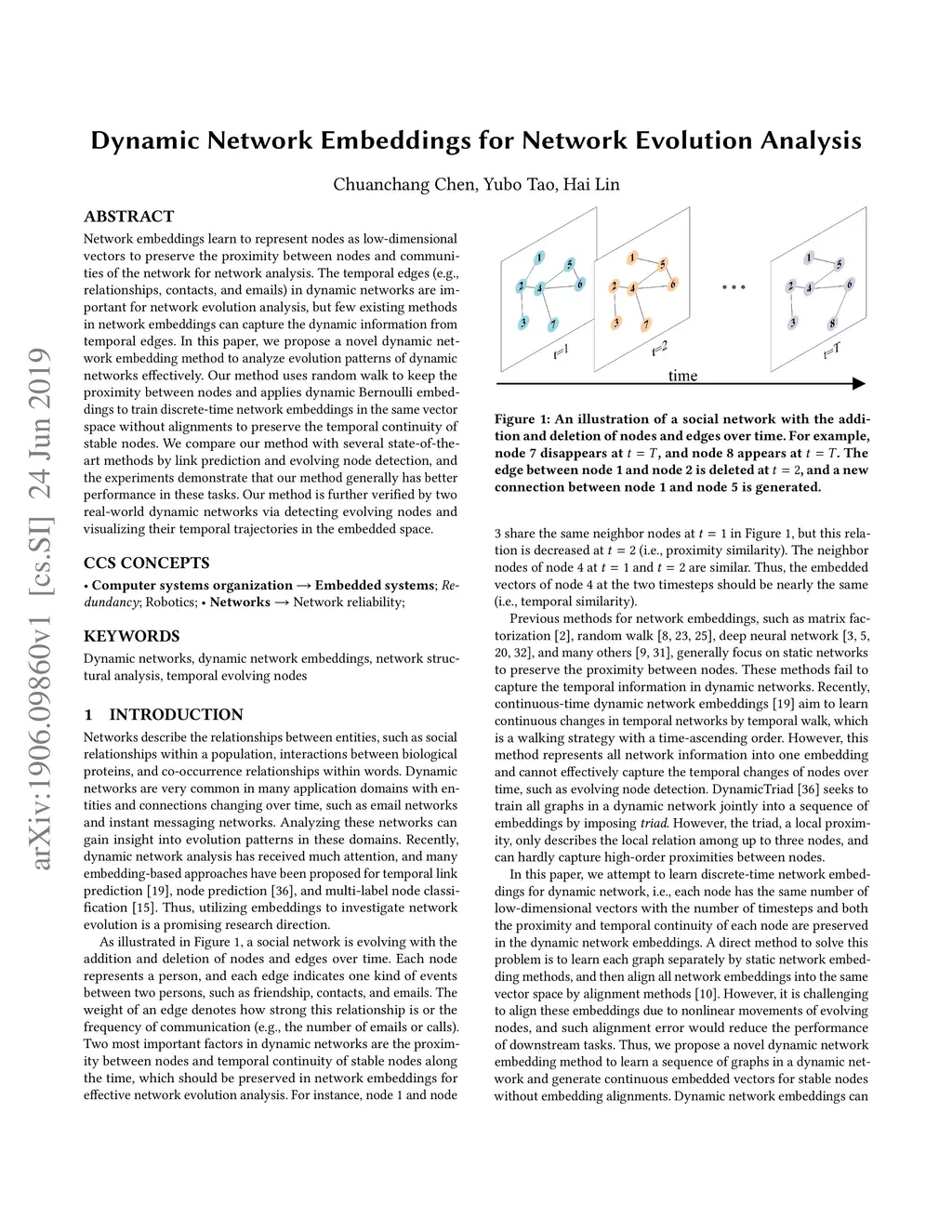Network embeddings learn to represent nodes as low-dimensional vectors to preserve the proximity between nodes and communities of the network for network analysis. The temporal edges (e.g., relationships, contacts, and emails) in dynamic networks are important for network evolution analysis, but few existing methods in network embeddings can capture the dynamic information from temporal edges. In this paper, we propose a novel dynamic network embedding method to analyze evolution patterns of dynamic networks effectively. Our method uses random walk to keep the proximity between nodes and applies dynamic Bernoulli embeddings to train discrete-time network embeddings in the same vector space without alignments to preserve the temporal continuity of stable nodes. We compare our method with several state-of-the-art methods by link prediction and evolving node detection, and the experiments demonstrate that our method generally has better performance in these tasks. Our method is further verified by two real-world dynamic networks via detecting evolving nodes and visualizing their temporal trajectories in the embedded space.