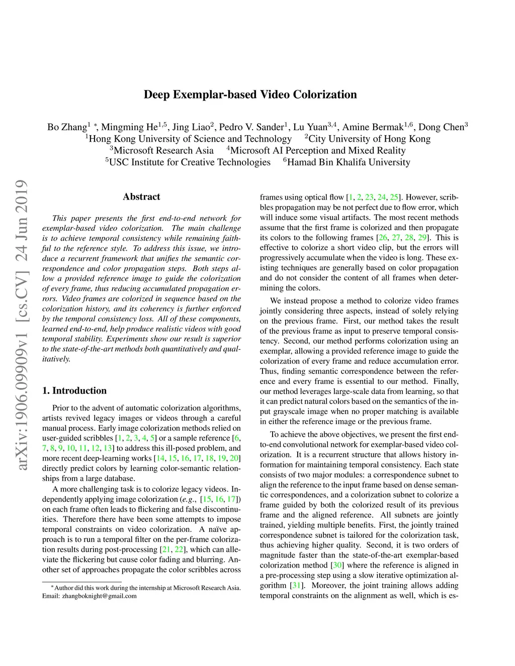 This paper presents the first end-to-end network for exemplar-based video colorization. The main challenge is to achieve temporal consistency while remaining faithful to the reference style. To address this issue, we introduce a recurrent framework that unifies the semantic correspondence and color propagation steps. Both steps allow a provided reference image to guide the colorization of every frame, thus reducing accumulated propagation errors. Video frames are colorized in sequence based on the colorization history, and its coherency is further enforced by the temporal consistency loss. All of these components, learned end-to-end, help produce realistic videos with good temporal stability. Experiments show our result is superior to the state-of-the-art methods both quantitatively and qualitatively.