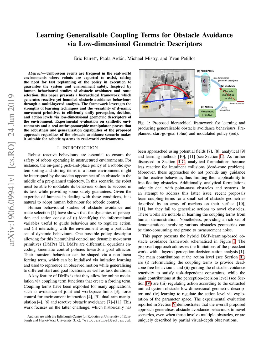 Unforeseen events are frequent in the real-world environments where robots are expected to assist, raising the need for fast replanning of the policy in execution to guarantee the system and environment safety. Inspired by human behavioural studies of obstacle avoidance and route selection, this paper presents a hierarchical framework which generates reactive yet bounded obstacle avoidance behaviours through a multi-layered analysis. The framework leverages the strengths of learning techniques and the versatility of dynamic movement primitives to efficiently unify perception, decision, and action levels via low-dimensional geometric descriptors of the environment. Experimental evaluation on synthetic environments and a real anthropomorphic manipulator proves that the robustness and generalisation capabilities of the proposed approach regardless of the obstacle avoidance scenario makes it suitable for robotic systems in real-world environments.