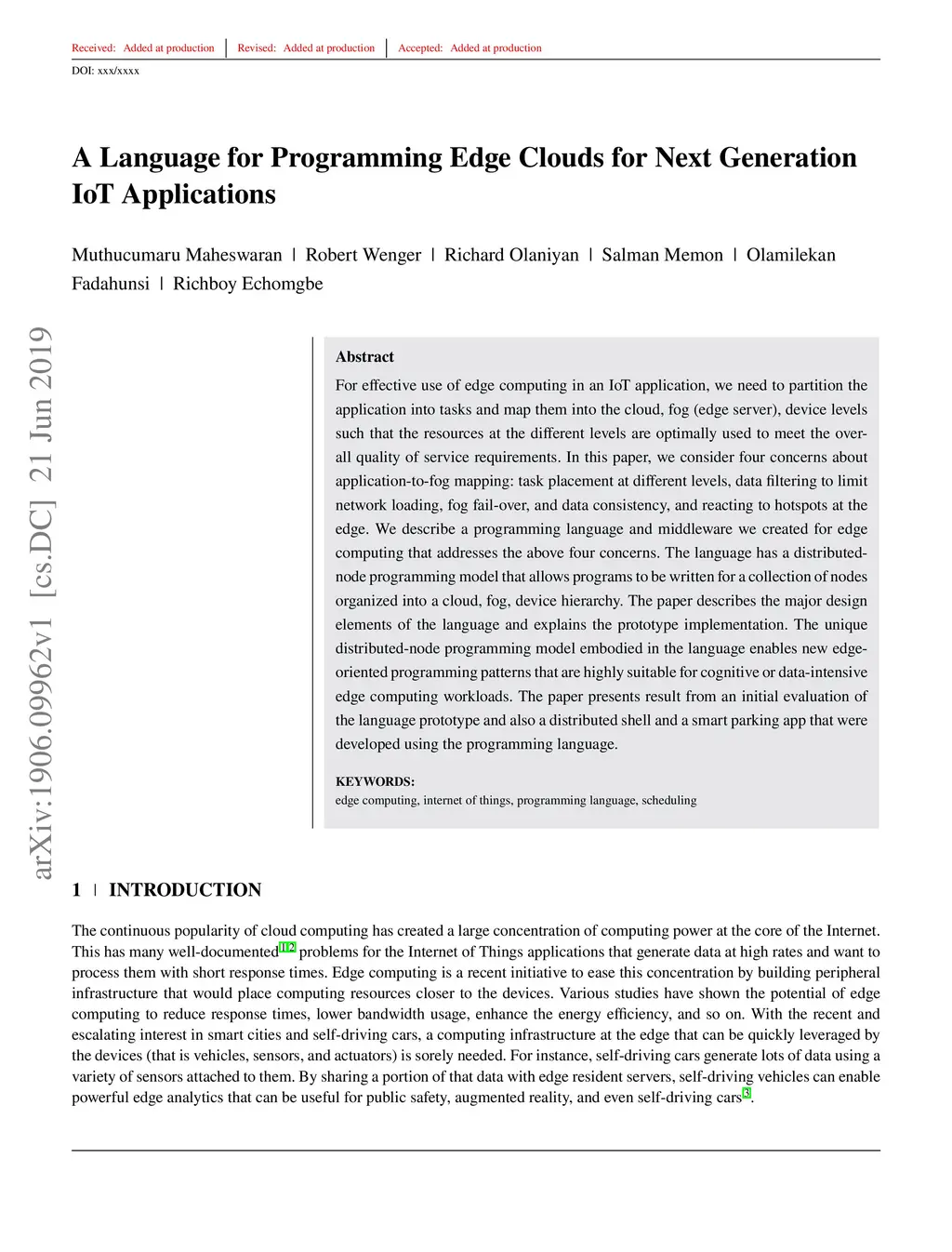 For effective use of edge computing in an IoT application, we need to partition the application into tasks and map them into the cloud, fog (edge server), device levels such that the resources at the different levels are optimally used to meet the overall quality of service requirements. In this paper, we consider four concerns about application-to-fog mapping: task placement at different levels, data filtering to limit network loading, fog fail-over, and data consistency, and reacting to hotspots at the edge. We describe a programming language and middleware we created for edge computing that addresses the above four concerns. The language has a distributed-node programming model that allows programs to be written for a collection of nodes organized into a cloud, fog, device hierarchy. The paper describes the major design elements of the language and explains the prototype implementation. The unique distributed-node programming model embodied in the language enables new edge-oriented programming patterns that are highly suitable for cognitive or data-intensive edge computing workloads. The paper presents result from an initial evaluation of the language prototype and also a distributed shell and a smart parking app that were developed using the programming language.