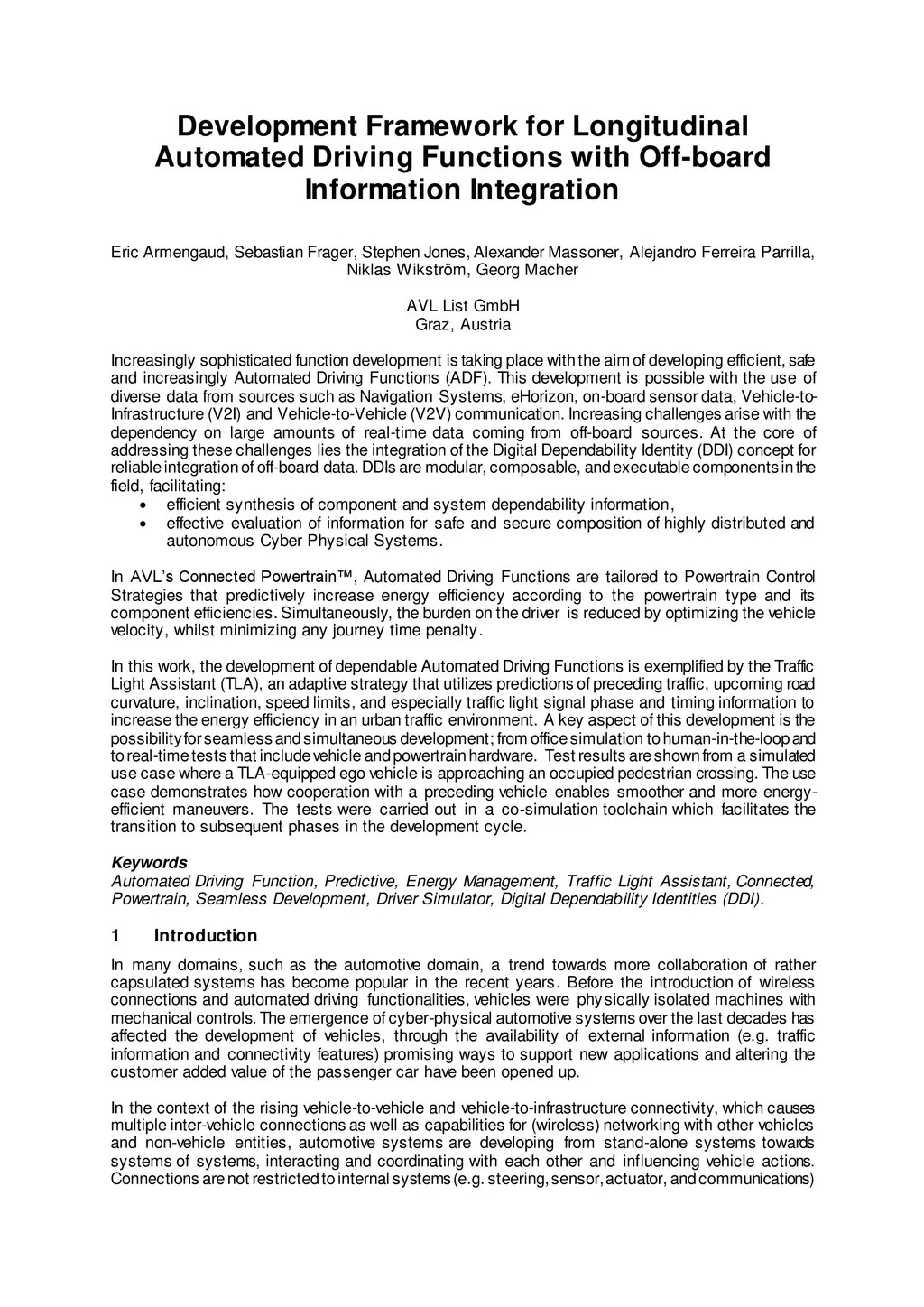 Increasingly sophisticated function development is taking place with the aim of developing efficient, safe and increasingly Automated Driving Functions. This development is possible with the use of diverse data from sources such as Navigation Systems, eHorizon, on-board sensor data, Vehicle-to-Infrastructure (V2I) and Vehicle-to-Vehicle (V2V) communication. Increasing challenges arise with the dependency on large amounts of real-time data coming from off-board sources. At the core of addressing these challenges lies the concept of a Digital Dependability Identity (DDI) of a component or system. DDIs are modular, composable, and executable components in the field, facilitating: efficient synthesis of component and system dependability information, effective evaluation of information for safe and secure composition of highly distributed and autonomous Cyber Physical Systems. In AVL's Connected Powertrain (TM), Automated Driving Functions are tailored to Powertrain Control Strategies that predictively increase energy efficiency according to the powertrain type and its component efficiencies. Simultaneously, the burden on the driver is reduced by optimizing the vehicle velocity, whilst minimizing any journey time penalty.In this work, the development of dependable Automated Driving Functions is exemplified by the Traffic Light Assistant, an adaptive strategy that utilizes predictions of preceding traffic, upcoming road curvature, inclination, speed limits, and especially traffic light signal phase and timing information to increase the energy efficiency in an urban traffic environment. A key aspect of this development is the possibility for seamless and simultaneous development; from office simulation to human-in-the-loop and to real-time tests that include vehicle and powertrain hardware. Driver's acceptance and comfort is rated in an advanced diver simulator mounted on a hexapod, capable of emulating longitudinal and lateral acceleration of a real vehicle. Test results from real-time function validation on a Powertrain Testbed are shown, including real traffic light signal phasing information and traffic flow representation on Graz city roads.