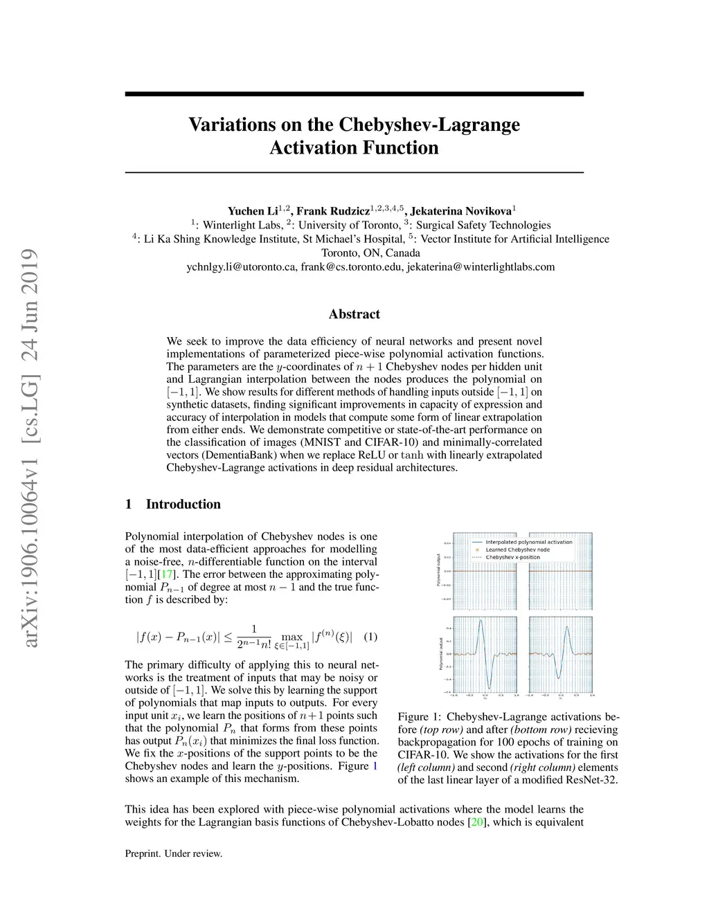 We seek to improve the data efficiency of neural networks and present novel implementations of parameterized piece-wise polynomial activation functions. The parameters are the y-coordinates of n+1 Chebyshev nodes per hidden unit and Lagrangian interpolation between the nodes produces the polynomial on [-1, 1]. We show results for different methods of handling inputs outside [-1, 1] on synthetic datasets, finding significant improvements in capacity of expression and accuracy of interpolation in models that compute some form of linear extrapolation from either ends. We demonstrate competitive or state-of-the-art performance on the classification of images (MNIST and CIFAR-10) and minimally-correlated vectors (DementiaBank) when we replace ReLU or tanh with linearly extrapolated Chebyshev-Lagrange activations in deep residual architectures.