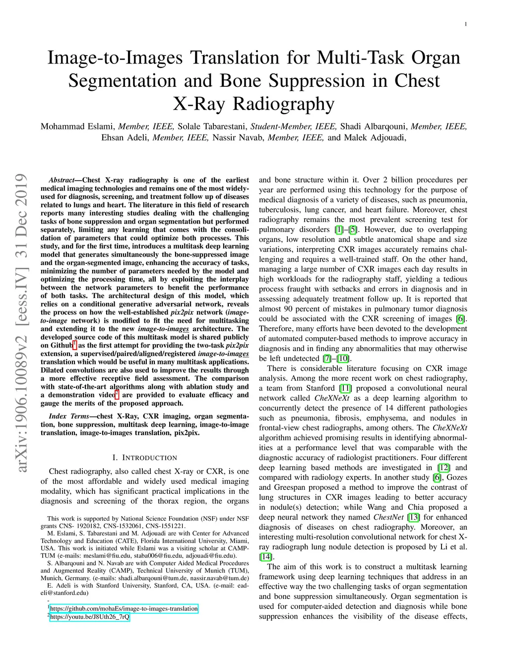 Chest X-ray radiography is one of the earliest medical imaging technologies and remains one of the most widely-used for diagnosis, screening, and treatment follow up of diseases related to lungs and heart. The literature in this field of research reports many interesting studies dealing with the challenging tasks of bone suppression and organ segmentation but performed separately, limiting any learning that comes with the consolidation of parameters that could optimize both processes. This study, and for the first time, introduces a multitask deep learning model that generates simultaneously the bone-suppressed image and the organ-segmented image, enhancing the accuracy of tasks, minimizing the number of parameters needed by the model and optimizing the processing time, all by exploiting the interplay between the network parameters to benefit the performance of both tasks. The architectural design of this model, which relies on a conditional generative adversarial network, reveals the process on how the well-established pix2pix network (image-to-image network) is modified to fit the need for multitasking and extending it to the new image-to-images architecture. The developed source code of this multitask model is shared publicly on Github as the first attempt for providing the two-task pix2pix extension, a supervised/paired/aligned/registered image-to-images translation which would be useful in many multitask applications. Dilated convolutions are also used to improve the results through a more effective receptive field assessment. The comparison with state-of-the-art algorithms along with ablation study and a demonstration video are provided to evaluate efficacy and gauge the merits of the proposed approach.
