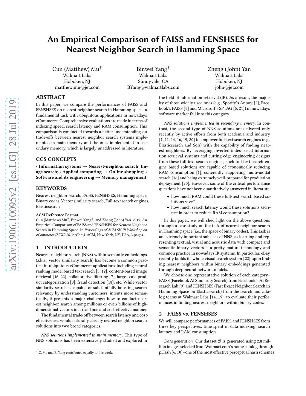 In this paper, we compare the performances of FAISS and FENSHSES on nearest neighbor search in Hamming space--a fundamental task with ubiquitous applications in nowadays eCommerce. Comprehensive evaluations are made in terms of indexing speed, search latency and RAM consumption. This comparison is conducted towards a better understanding on trade-offs between nearest neighbor search systems implemented in main memory and the ones implemented in secondary memory, which is largely unaddressed in literature.