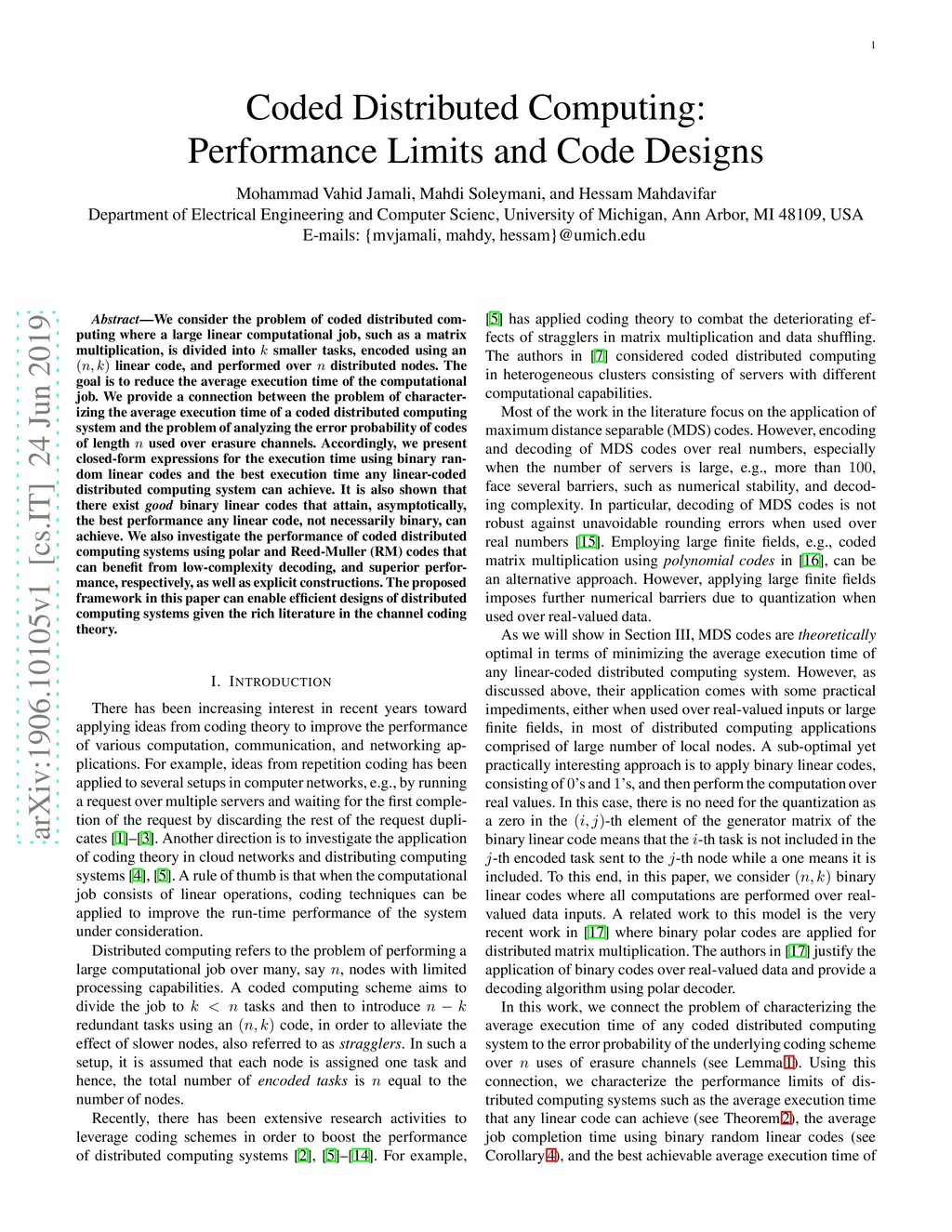 We consider the problem of coded distributed computing where a large linear computational job, such as a matrix multiplication, is divided into smaller tasks, encoded using an linear code, and performed over distributed nodes. The goal is to reduce the average execution time of the computational job. We provide a connection between the problem of characterizing the average execution time of a coded distributed computing system and the problem of analyzing the error probability of codes of length used over erasure channels. Accordingly, we present closed-form expressions for the execution time using binary random linear codes and the best execution time any linear-coded distributed computing system can achieve. It is also shown that there exist good binary linear codes that attain, asymptotically, the best performance any linear code, not necessarily binary, can achieve. We also investigate the performance of coded distributed computing systems using polar and Reed-Muller (RM) codes that can benefit from low-complexity decoding, and superior performance, respectively, as well as explicit constructions. The proposed framework in this paper can enable efficient designs of distributed computing systems given the rich literature in the channel coding theory.