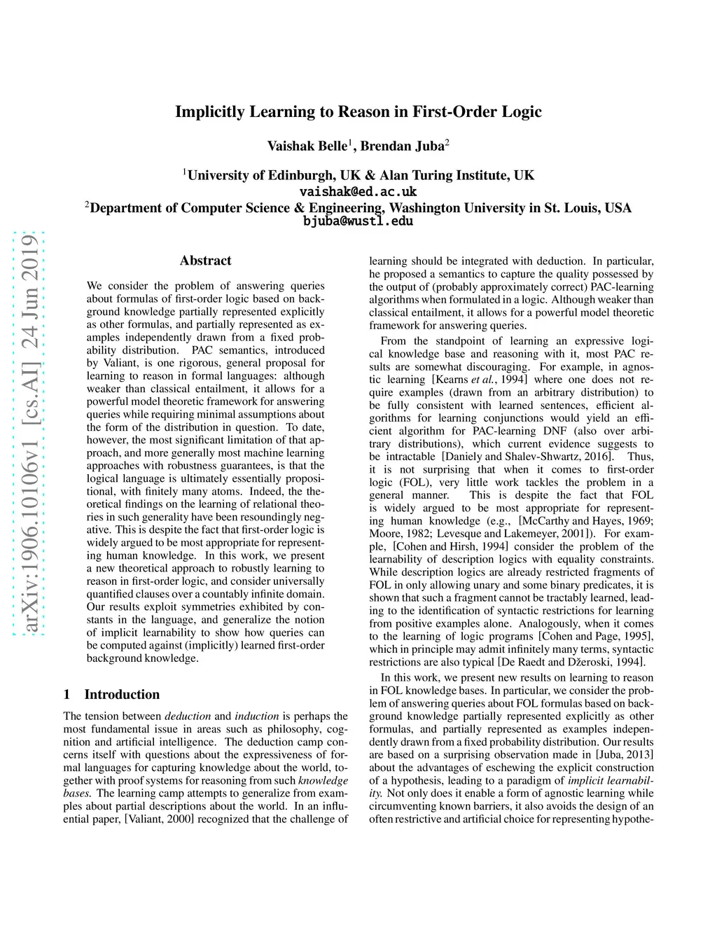 We consider the problem of answering queries about formulas of first-order logic based on background knowledge partially represented explicitly as other formulas, and partially represented as examples independently drawn from a fixed probability distribution. PAC semantics, introduced by Valiant, is one rigorous, general proposal for learning to reason in formal languages: although weaker than classical entailment, it allows for a powerful model theoretic framework for answering queries while requiring minimal assumptions about the form of the distribution in question. To date, however, the most significant limitation of that approach, and more generally most machine learning approaches with robustness guarantees, is that the logical language is ultimately essentially propositional, with finitely many atoms. Indeed, the theoretical findings on the learning of relational theories in such generality have been resoundingly negative. This is despite the fact that first-order logic is widely argued to be most appropriate for representing human knowledge. In this work, we present a new theoretical approach to robustly learning to reason in first-order logic, and consider universally quantified clauses over a countably infinite domain. Our results exploit symmetries exhibited by constants in the language, and generalize the notion of implicit learnability to show how queries can be computed against (implicitly) learned first-order background knowledge.
