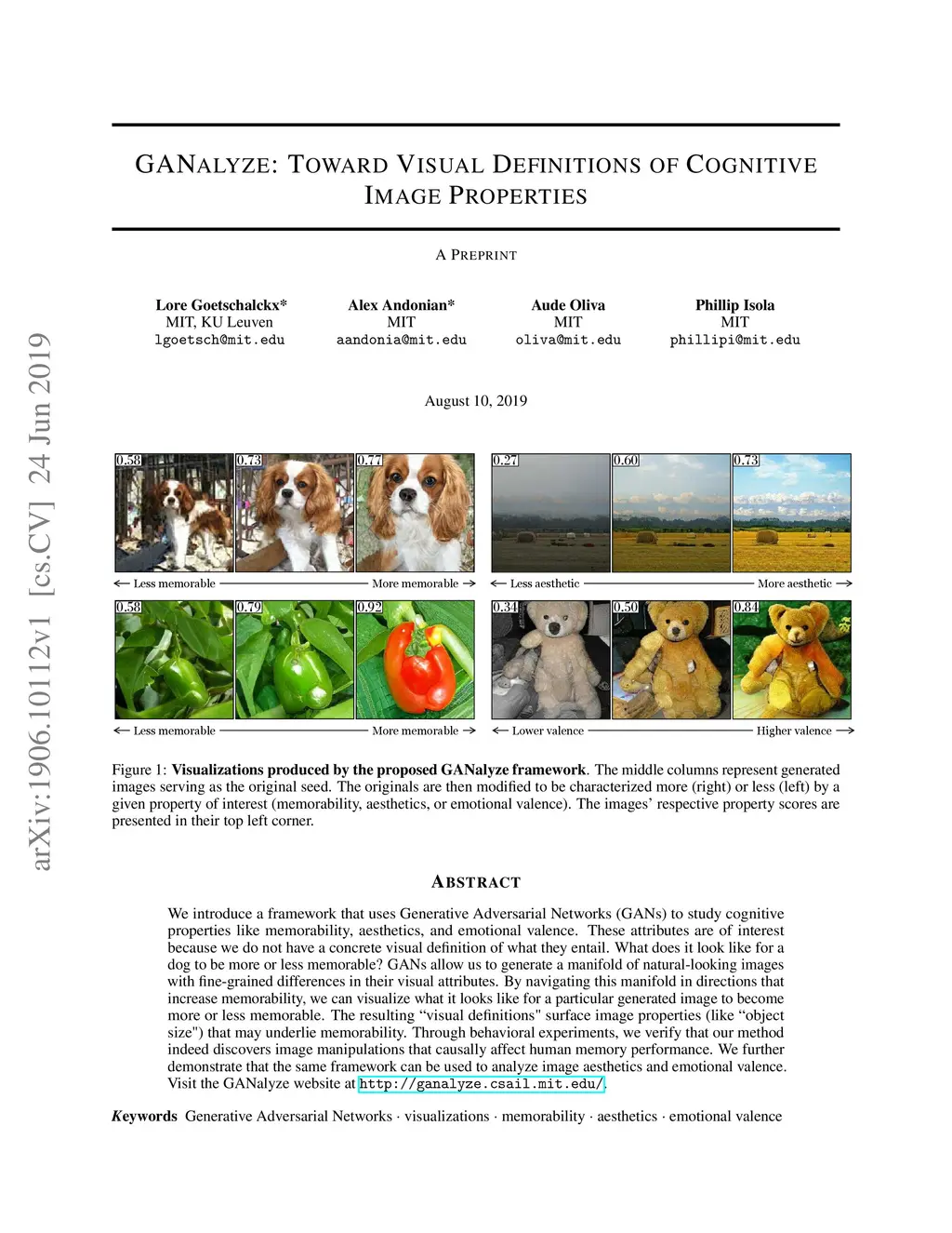 We introduce a framework that uses Generative Adversarial Networks (GANs) to study cognitive properties like memorability, aesthetics, and emotional valence. These attributes are of interest because we do not have a concrete visual definition of what they entail. What does it look like for a dog to be more or less memorable? GANs allow us to generate a manifold of natural-looking images with fine-grained differences in their visual attributes. By navigating this manifold in directions that increase memorability, we can visualize what it looks like for a particular generated image to become more or less memorable. The resulting ``visual definitions" surface image properties (like ``object size") that may underlie memorability. Through behavioral experiments, we verify that our method indeed discovers image manipulations that causally affect human memory performance. We further demonstrate that the same framework can be used to analyze image aesthetics and emotional valence. Visit the GANalyze website at http://ganalyze.csail.mit.edu/.