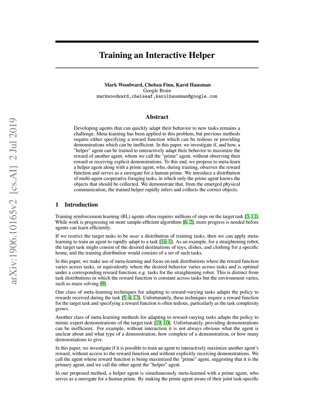 Developing agents that can quickly adapt their behavior to new tasks remains a challenge. Meta-learning has been applied to this problem, but previous methods require either specifying a reward function which can be tedious or providing demonstrations which can be inefficient. In this paper, we investigate if, and how, a "helper" agent can be trained to interactively adapt their behavior to maximize the reward of another agent, whom we call the "prime" agent, without observing their reward or receiving explicit demonstrations. To this end, we propose to meta-learn a helper agent along with a prime agent, who, during training, observes the reward function and serves as a surrogate for a human prime. We introduce a distribution of multi-agent cooperative foraging tasks, in which only the prime agent knows the objects that should be collected. We demonstrate that, from the emerged physical communication, the trained helper rapidly infers and collects the correct objects.