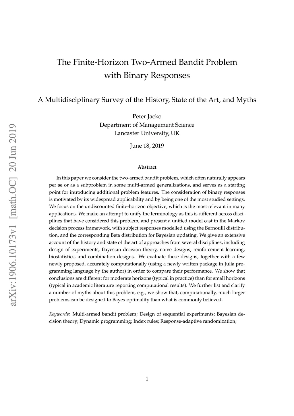 In this paper we consider the two-armed bandit problem, which often naturally appears per se or as a subproblem in some multi-armed generalizations, and serves as a starting point for introducing additional problem features. The consideration of binary responses is motivated by its widespread applicability and by being one of the most studied settings. We focus on the undiscounted finite-horizon objective, which is the most relevant in many applications. We make an attempt to unify the terminology as this is different across disciplines that have considered this problem, and present a unified model cast in the Markov decision process framework, with subject responses modelled using the Bernoulli distribution, and the corresponding Beta distribution for Bayesian updating. We give an extensive account of the history and state of the art of approaches from several disciplines, including design of experiments, Bayesian decision theory, naive designs, reinforcement learning, biostatistics, and combination designs. We evaluate these designs, together with a few newly proposed, accurately computationally (using a newly written package in Julia programming language by the author) in order to compare their performance. We show that conclusions are different for moderate horizons (typical in practice) than for small horizons (typical in academic literature reporting computational results). We further list and clarify a number of myths about this problem, e.g., we show that, computationally, much larger problems can be designed to Bayes-optimality than what is commonly believed.