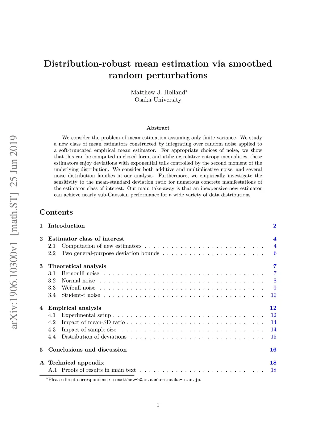 We consider the problem of mean estimation assuming only finite variance. We study a new class of mean estimators constructed by integrating over random noise applied to a soft-truncated empirical mean estimator. For appropriate choices of noise, we show that this can be computed in closed form, and utilizing relative entropy inequalities, these estimators enjoy deviations with exponential tails controlled by the second moment of the underlying distribution. We consider both additive and multiplicative noise, and several noise distribution families in our analysis. Furthermore, we empirically investigate the sensitivity to the mean-standard deviation ratio for numerous concrete manifestations of the estimator class of interest. Our main take-away is that an inexpensive new estimator can achieve nearly sub-Gaussian performance for a wide variety of data distributions.