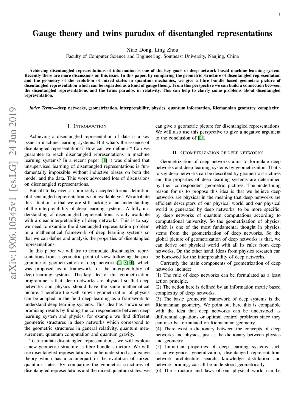 Achieving disentangled representations of information is one of the key goals of deep network based machine learning system. Recently there are more discussions on this issue. In this paper, by comparing the geometric structure of disentangled representation and the geometry of the evolution of mixed states in quantum mechanics, we give a fibre bundle based geometric picture of disentangled representation which can be regarded as a kind of gauge theory. From this perspective we can build a connection between the disentangled representations and the twins paradox in relativity. This can help to clarify some problems about disentangled representation.