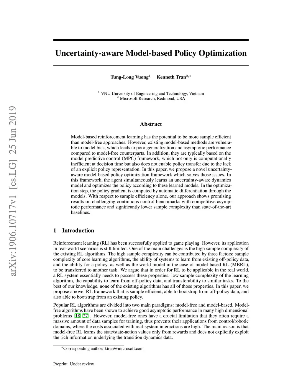 Model-based reinforcement learning has the potential to be more sample efficient than model-free approaches. However, existing model-based methods are vulnerable to model bias, which leads to poor generalization and asymptotic performance compared to model-free counterparts. In addition, they are typically based on the model predictive control (MPC) framework, which not only is computationally inefficient at decision time but also does not enable policy transfer due to the lack of an explicit policy representation. In this paper, we propose a novel uncertainty-aware model-based policy optimization framework which solves those issues. In this framework, the agent simultaneously learns an uncertainty-aware dynamics model and optimizes the policy according to these learned models. In the optimization step, the policy gradient is computed by automatic differentiation through the models. With respect to sample efficiency alone, our approach shows promising results on challenging continuous control benchmarks with competitive asymptotic performance and significantly lower sample complexity than state-of-the-art baselines.