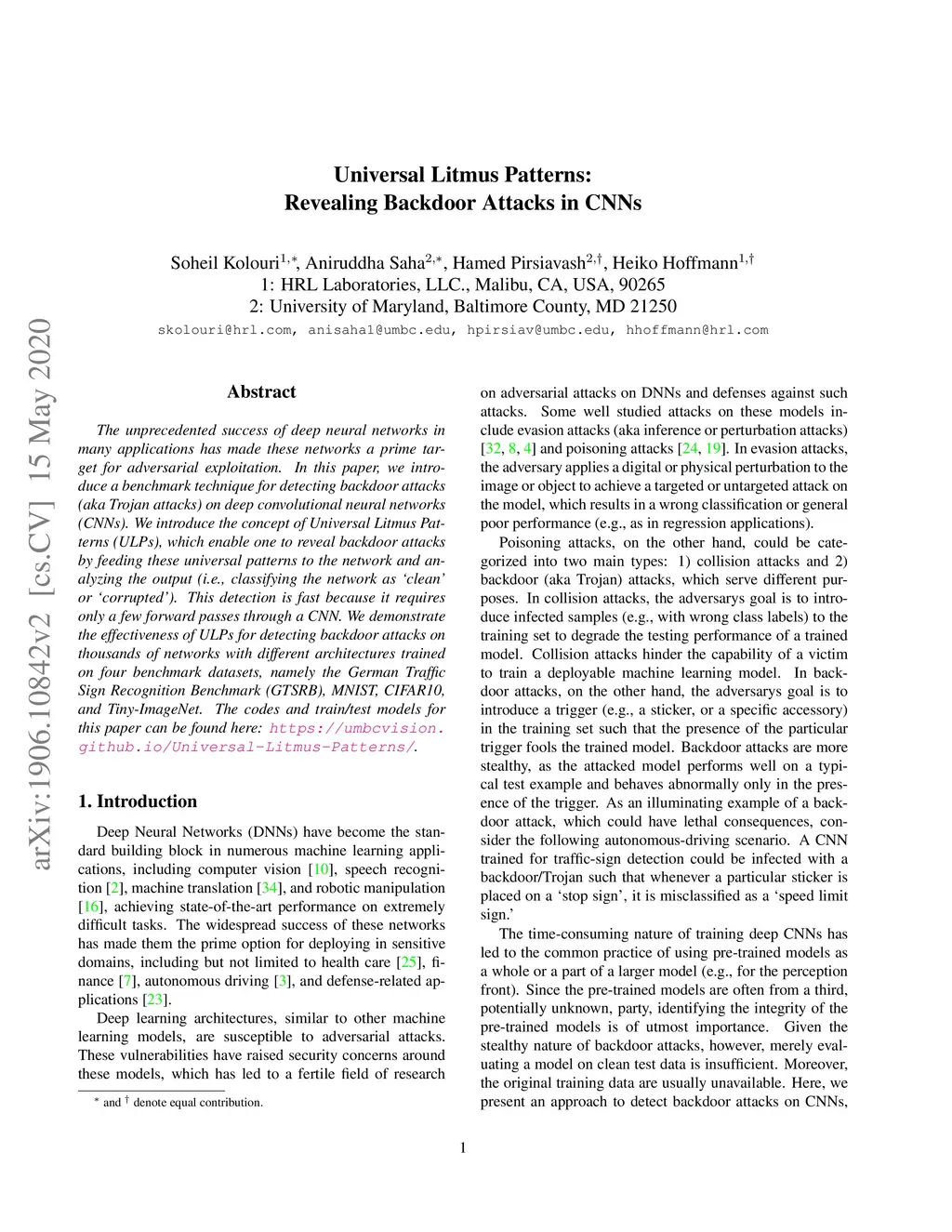 The unprecedented success of deep neural networks in many applications has made these networks a prime target for adversarial exploitation. In this paper, we introduce a benchmark technique for detecting backdoor attacks (aka Trojan attacks) on deep convolutional neural networks (CNNs). We introduce the concept of Universal Litmus Patterns (ULPs), which enable one to reveal backdoor attacks by feeding these universal patterns to the network and analyzing the output (i.e., classifying the network as `clean' or `corrupted'). This detection is fast because it requires only a few forward passes through a CNN. We demonstrate the effectiveness of ULPs for detecting backdoor attacks on thousands of networks with different architectures trained on four benchmark datasets, namely the German Traffic Sign Recognition Benchmark (GTSRB), MNIST, CIFAR10, and Tiny-ImageNet. The codes and train/test models for this paper can be found here https://umbcvision.github.io/Universal-Litmus-Patterns/.