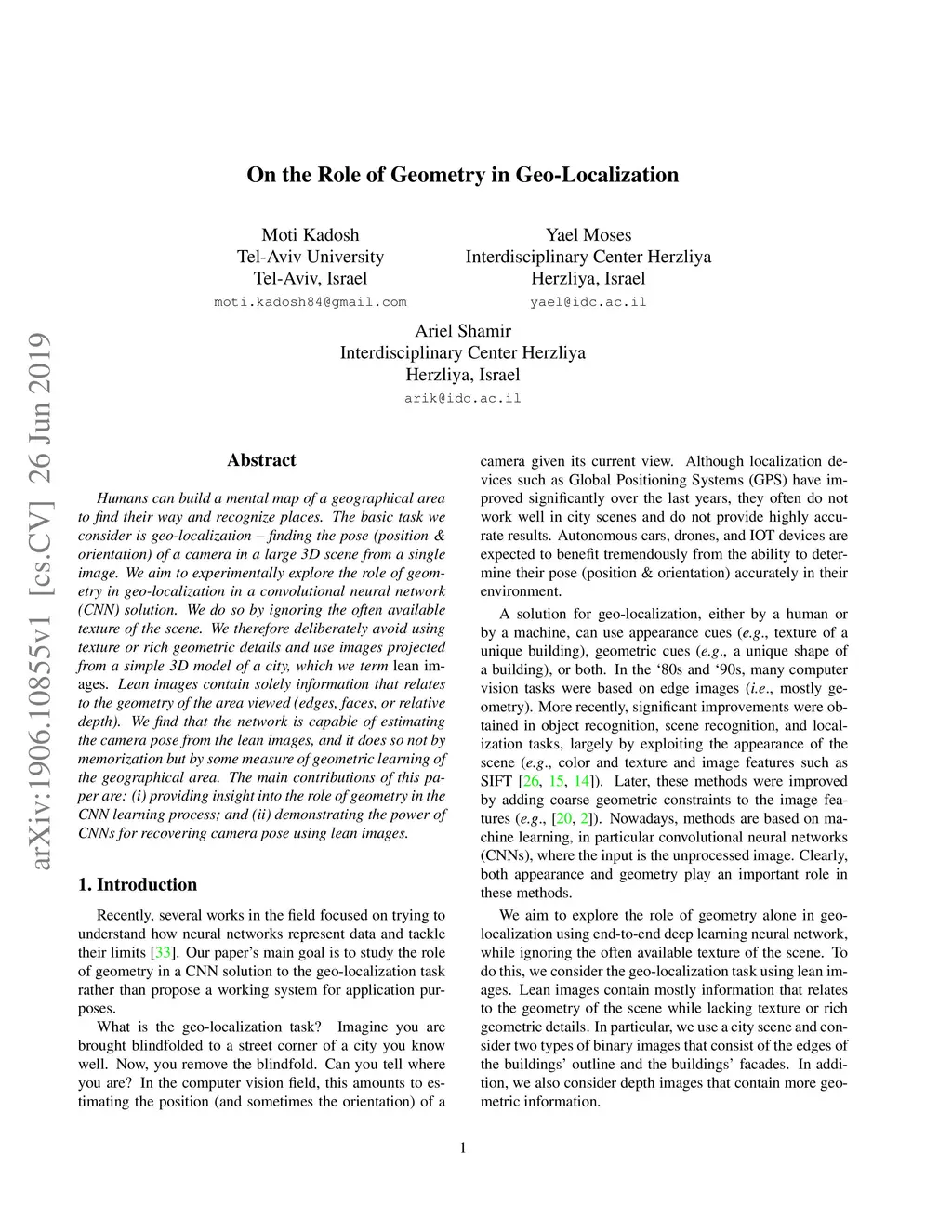 Humans can build a mental map of a geographical area to find their way and recognize places. The basic task we consider is geo-localization - finding the pose (position & orientation) of a camera in a large 3D scene from a single image. We aim to experimentally explore the role of geometry in geo-localization in a convolutional neural network (CNN) solution. We do so by ignoring the often available texture of the scene. We therefore deliberately avoid using texture or rich geometric details and use images projected from a simple 3D model of a city, which we term lean images. Lean images contain solely information that relates to the geometry of the area viewed (edges, faces, or relative depth). We find that the network is capable of estimating the camera pose from the lean images, and it does so not by memorization but by some measure of geometric learning of the geographical area. The main contributions of this paper are: (i) providing insight into the role of geometry in the CNN learning process; and (ii) demonstrating the power of CNNs for recovering camera pose using lean images.
