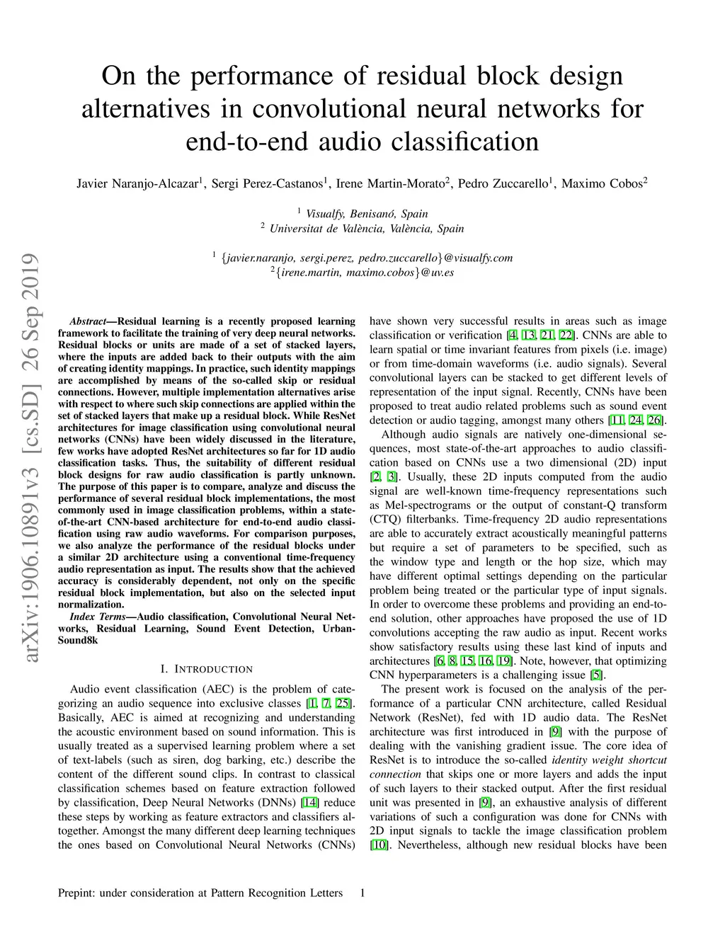Residual learning is a recently proposed learning framework to facilitate the training of very deep neural networks. Residual blocks or units are made of a set of stacked layers, where the inputs are added back to their outputs with the aim of creating identity mappings. In practice, such identity mappings are accomplished by means of the so-called skip or residual connections. However, multiple implementation alternatives arise with respect to where such skip connections are applied within the set of stacked layers that make up a residual block. While ResNet architectures for image classification using convolutional neural networks (CNNs) have been widely discussed in the literature, few works have adopted ResNet architectures so far for 1D audio classification tasks. Thus, the suitability of different residual block designs for raw audio classification is partly unknown. The purpose of this paper is to analyze and discuss the performance of several residual block implementations within a state-of-the-art CNN-based architecture for end-to-end audio classification using raw audio waveforms. For comparison purposes, we analyze as well the performance of the residual blocks under a similar 2D architecture using a conventional time-frequency audio represen-tation as input. The results show that the achieved accuracy is considerably dependent, not only on the specific residual block implementation, but also on the selected input normalization.