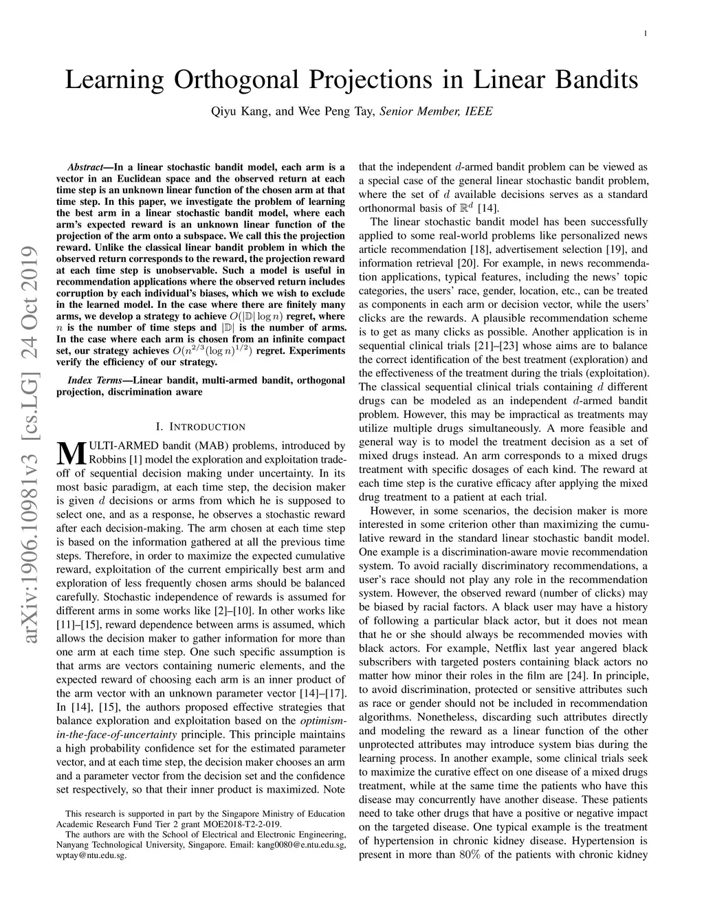 In a linear stochastic bandit model, each arm is a vector in an Euclidean space and the observed return at each time step is an unknown linear function of the chosen arm at that time step. In this paper, we investigate the problem of learning the best arm in a linear stochastic bandit model, where each arm's expected reward is an unknown linear function of the projection of the arm onto a subspace. We call this the projection reward. Unlike the classical linear bandit problem in which the observed return corresponds to the reward, the projection reward at each time step is unobservable. Such a model is useful in recommendation applications where the observed return includes corruption by each individual's biases, which we wish to exclude in the learned model. In the case where there are finitely many arms, we develop a strategy to achieve regret, where is the number of time steps and is the number of arms. In the case where each arm is chosen from an infinite compact set, our strategy achieves regret. Experiments verify the efficiency of our strategy.