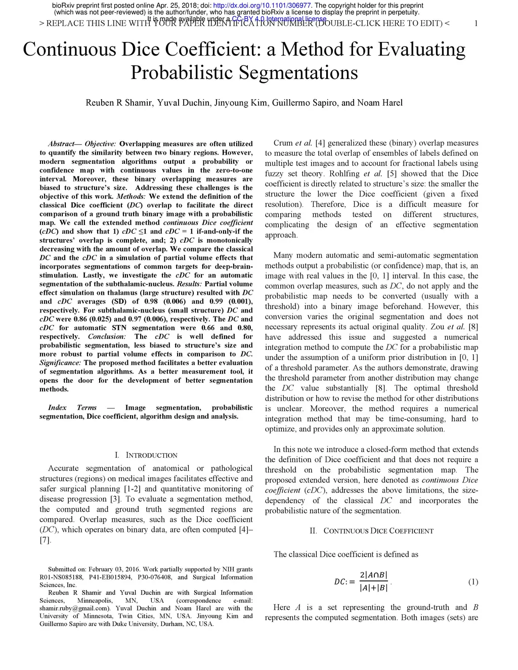 Objective: Overlapping measures are often utilized to quantify the similarity between two binary regions. However, modern segmentation algorithms output a probability or confidence map with continuous values in the zero-to-one interval. Moreover, these binary overlapping measures are biased to structure size. Addressing these challenges is the objective of this work. Methods: We extend the definition of the classical Dice coefficient (DC) overlap to facilitate the direct comparison of a ground truth binary image with a probabilistic map. We call the extended method continuous Dice coefficient (cDC) and show that 1) cDC is less or equal to 1 and cDC = 1 if-and-only-if the structures overlap is complete, and, 2) cDC is monotonically decreasing with the amount of overlap. We compare the classical DC and the cDC in a simulation of partial volume effects that incorporates segmentations of common targets for deep-brainstimulation. Lastly, we investigate the cDC for an automatic segmentation of the subthalamic-nucleus. Results: Partial volume effect simulation on thalamus (large structure) resulted with DC and cDC averages (SD) of 0.98 (0.006) and 0.99 (0.001), respectively. For subthalamic-nucleus (small structure) DC and cDC were 0.86 (0.025) and 0.97 (0.006), respectively. The DC and cDC for automatic STN segmentation were 0.66 and 0.80, respectively. Conclusion: The cDC is well defined for probabilistic segmentation, less biased to structure size and more robust to partial volume effects in comparison to DC. Significance: The proposed method facilitates a better evaluation of segmentation algorithms. As a better measurement tool, it opens the door for the development of better segmentation methods.