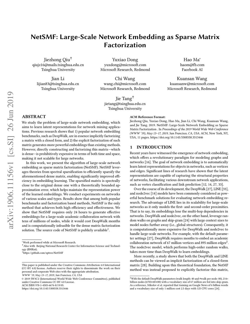 NetSMF: Large-Scale Network Embedding as Sparse Matrix Factorization