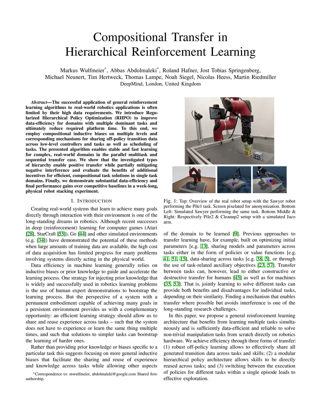 The successful application of general reinforcement learning algorithms to real-world robotics applications is often limited by their high data requirements. We introduce Regularized Hierarchical Policy Optimization (RHPO) to improve data-efficiency for domains with multiple dominant tasks and ultimately reduce required platform time. To this end, we employ compositional inductive biases on multiple levels and corresponding mechanisms for sharing off-policy transition data across low-level controllers and tasks as well as scheduling of tasks. The presented algorithm enables stable and fast learning for complex, real-world domains in the parallel multitask and sequential transfer case. We show that the investigated types of hierarchy enable positive transfer while partially mitigating negative interference and evaluate the benefits of additional incentives for efficient, compositional task solutions in single task domains. Finally, we demonstrate substantial data-efficiency and final performance gains over competitive baselines in a week-long, physical robot stacking experiment.