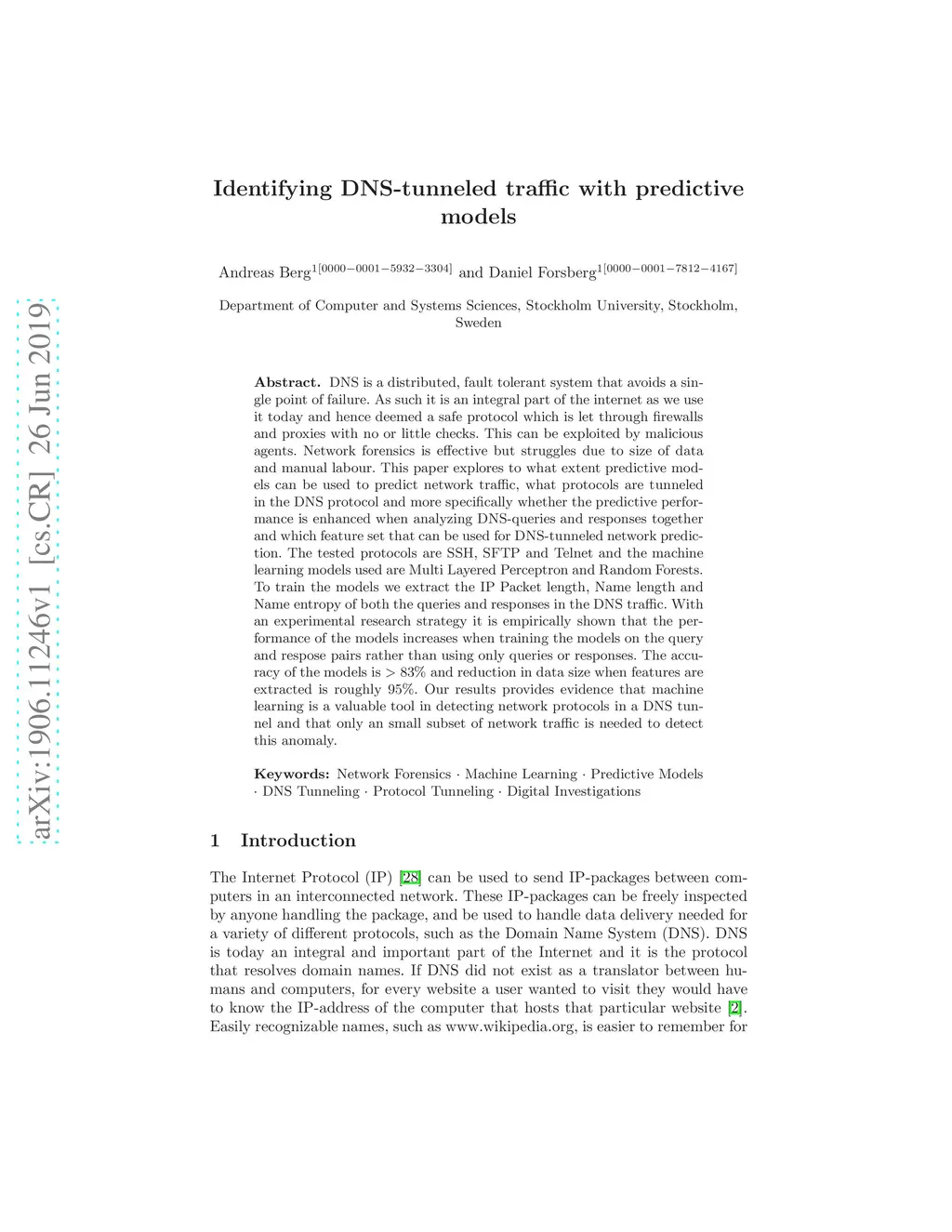 DNS is a distributed, fault tolerant system that avoids a single point of failure. As such it is an integral part of the internet as we use it today and hence deemed a safe protocol which is let through firewalls and proxies with no or little checks. This can be exploited by malicious agents. Network forensics is effective but struggles due to size of data and manual labour. This paper explores to what extent predictive models can be used to predict network traffic, what protocols are tunneled in the DNS protocol and more specifically whether the predictive performance is enhanced when analyzing DNS-queries and responses together and which feature set that can be used for DNS-tunneled network prediction. The tested protocols are SSH, SFTP and Telnet and the machine learning models used are Multi Layered Perceptron and Random Forests. To train the models we extract the IP Packet length, Name length and Name entropy of both the queries and responses in the DNS traffic. With an experimental research strategy it is empirically shown that the performance of the models increases when training the models on the query and respose pairs rather than using only queries or responses. The accuracy of the models is >83% and reduction in data size when features are extracted is roughly 95%. Our results provides evidence that machine learning is a valuable tool in detecting network protocols in a DNS tunnel and that only an small subset of network traffic is needed to detect this anomaly.