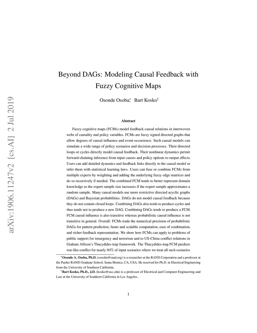 Fuzzy cognitive maps (FCMs) model feedback causal relations in interwoven webs of causality and policy variables. FCMs are fuzzy signed directed graphs that allow degrees of causal influence and event occurrence. Such causal models can simulate a wide range of policy scenarios and decision processes. Their directed loops or cycles directly model causal feedback. Their nonlinear dynamics permit forward-chaining inference from input causes and policy options to output effects. Users can add detailed dynamics and feedback links directly to the causal model or infer them with statistical learning laws. Users can fuse or combine FCMs from multiple experts by weighting and adding the underlying fuzzy edge matrices and do so recursively if needed. The combined FCM tends to better represent domain knowledge as the expert sample size increases if the expert sample approximates a random sample. Many causal models use more restrictive directed acyclic graphs (DAGs) and Bayesian probabilities. DAGs do not model causal feedback because they do not contain closed loops. Combining DAGs also tends to produce cycles and thus tends not to produce a new DAG. Combining DAGs tends to produce a FCM. FCM causal influence is also transitive whereas probabilistic causal influence is not transitive in general. Overall: FCMs trade the numerical precision of probabilistic DAGs for pattern prediction, faster and scalable computation, ease of combination, and richer feedback representation. We show how FCMs can apply to problems of public support for insurgency and terrorism and to US-China conflict relations in Graham Allison's Thucydides-trap framework. The appendix gives the textual justification of the Thucydides-trap FCM. It also extends our earlier theorem [Osoba-Kosko2017] to a more general result that shows the transitive and total causal influence that upstream concept nodes exert on downstream nodes.