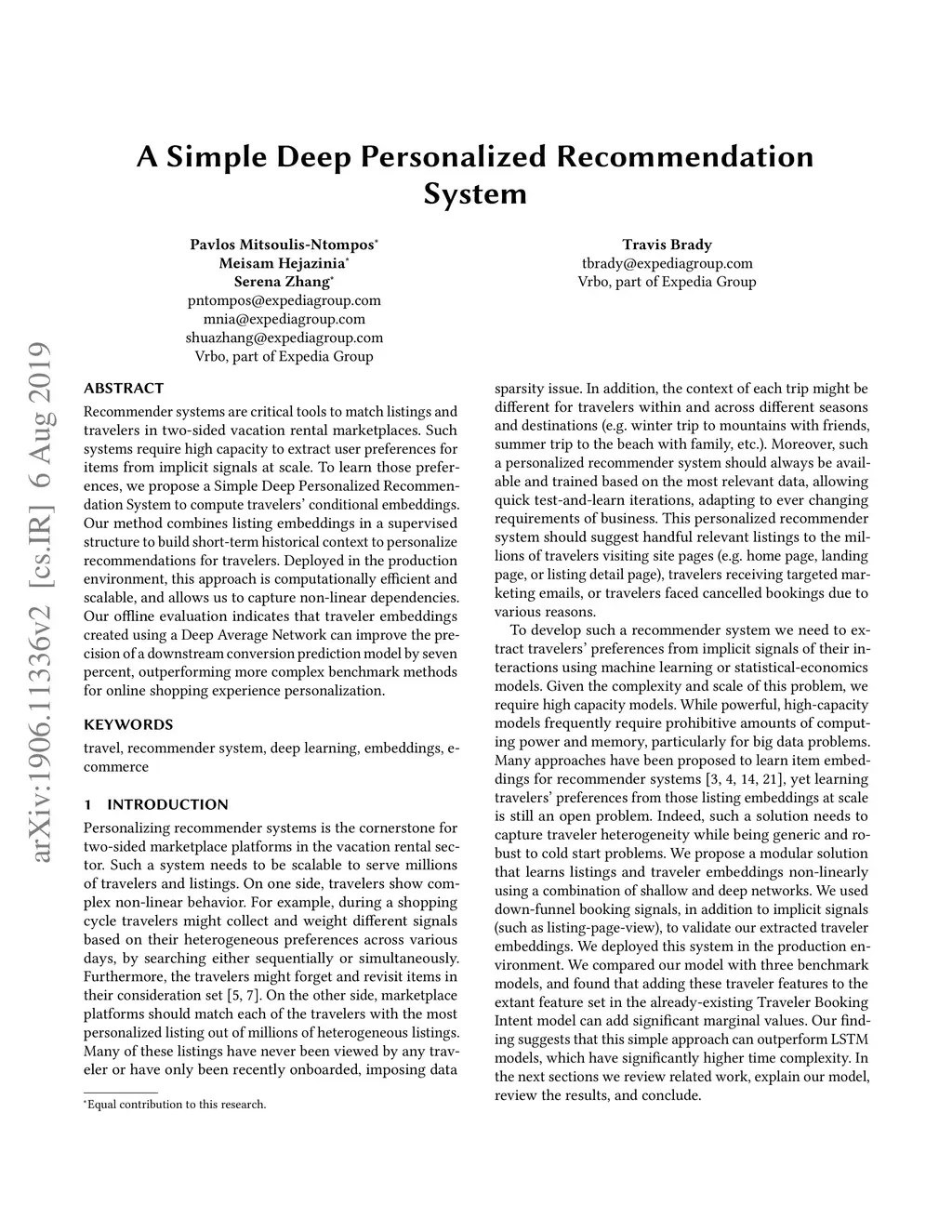 Recommender systems are critical tools to match listings and travelers in two-sided vacation rental marketplaces. Such systems require high capacity to extract user preferences for items from implicit signals at scale. To learn those preferences, we propose a Simple Deep Personalized Recommendation System to compute travelers' conditional embeddings. Our method combines listing embeddings in a supervised structure to build short-term historical context to personalize recommendations for travelers. Deployed in the production environment, this approach is computationally efficient and scalable, and allows us to capture non-linear dependencies. Our offline evaluation indicates that traveler embeddings created using a Deep Average Network can improve the precision of a downstream conversion prediction model by seven percent, outperforming more complex benchmark methods for online shopping experience personalization.