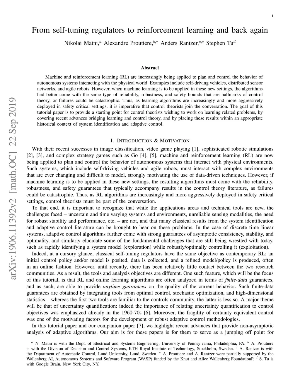 Machine and reinforcement learning (RL) are increasingly being applied to plan and control the behavior of autonomous systems interacting with the physical world. Examples include self-driving vehicles, distributed sensor networks, and agile robots. However, when machine learning is to be applied in these new settings, the algorithms had better come with the same type of reliability, robustness, and safety bounds that are hallmarks of control theory, or failures could be catastrophic. Thus, as learning algorithms are increasingly and more aggressively deployed in safety critical settings, it is imperative that control theorists join the conversation. The goal of this tutorial paper is to provide a starting point for control theorists wishing to work on learning related problems, by covering recent advances bridging learning and control theory, and by placing these results within an appropriate historical context of system identification and adaptive control.