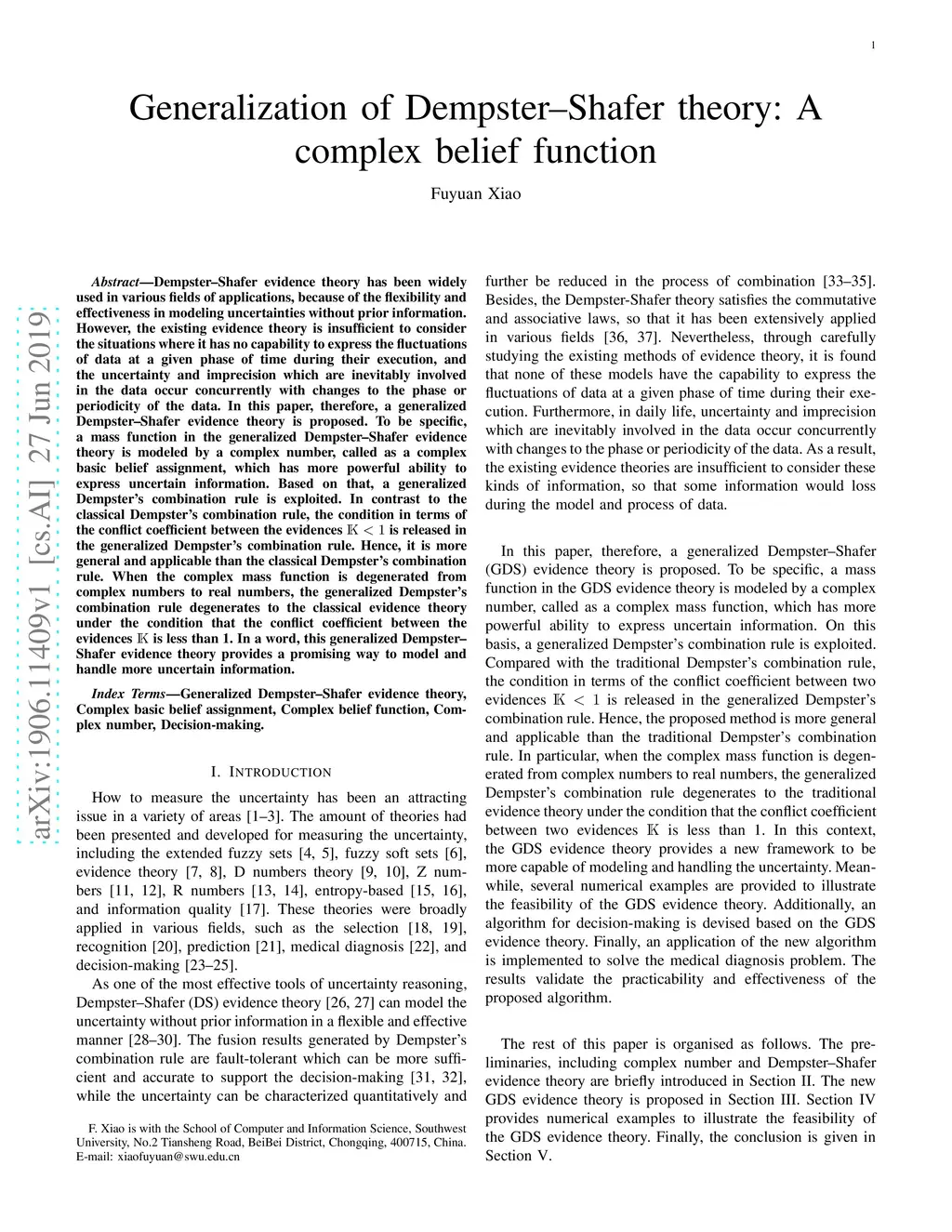 Generalization of Dempster-Shafer theory: A complex belief function
