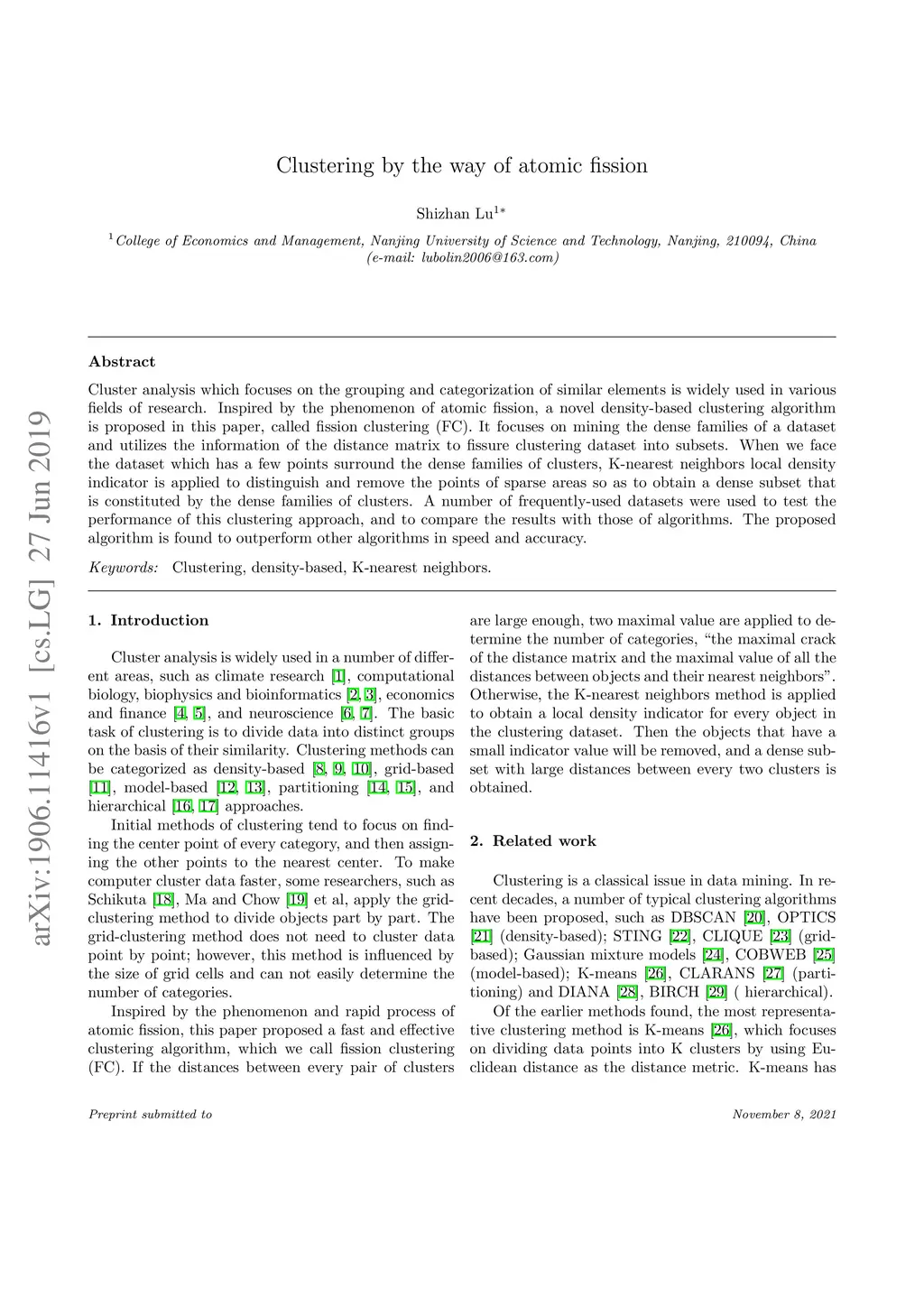Cluster analysis which focuses on the grouping and categorization of similar elements is widely used in various fields of research. Inspired by the phenomenon of atomic fission, a novel density-based clustering algorithm is proposed in this paper, called fission clustering (FC). It focuses on mining the dense families of a dataset and utilizes the information of the distance matrix to fissure clustering dataset into subsets. When we face the dataset which has a few points surround the dense families of clusters, K-nearest neighbors local density indicator is applied to distinguish and remove the points of sparse areas so as to obtain a dense subset that is constituted by the dense families of clusters. A number of frequently-used datasets were used to test the performance of this clustering approach, and to compare the results with those of algorithms. The proposed algorithm is found to outperform other algorithms in speed and accuracy.