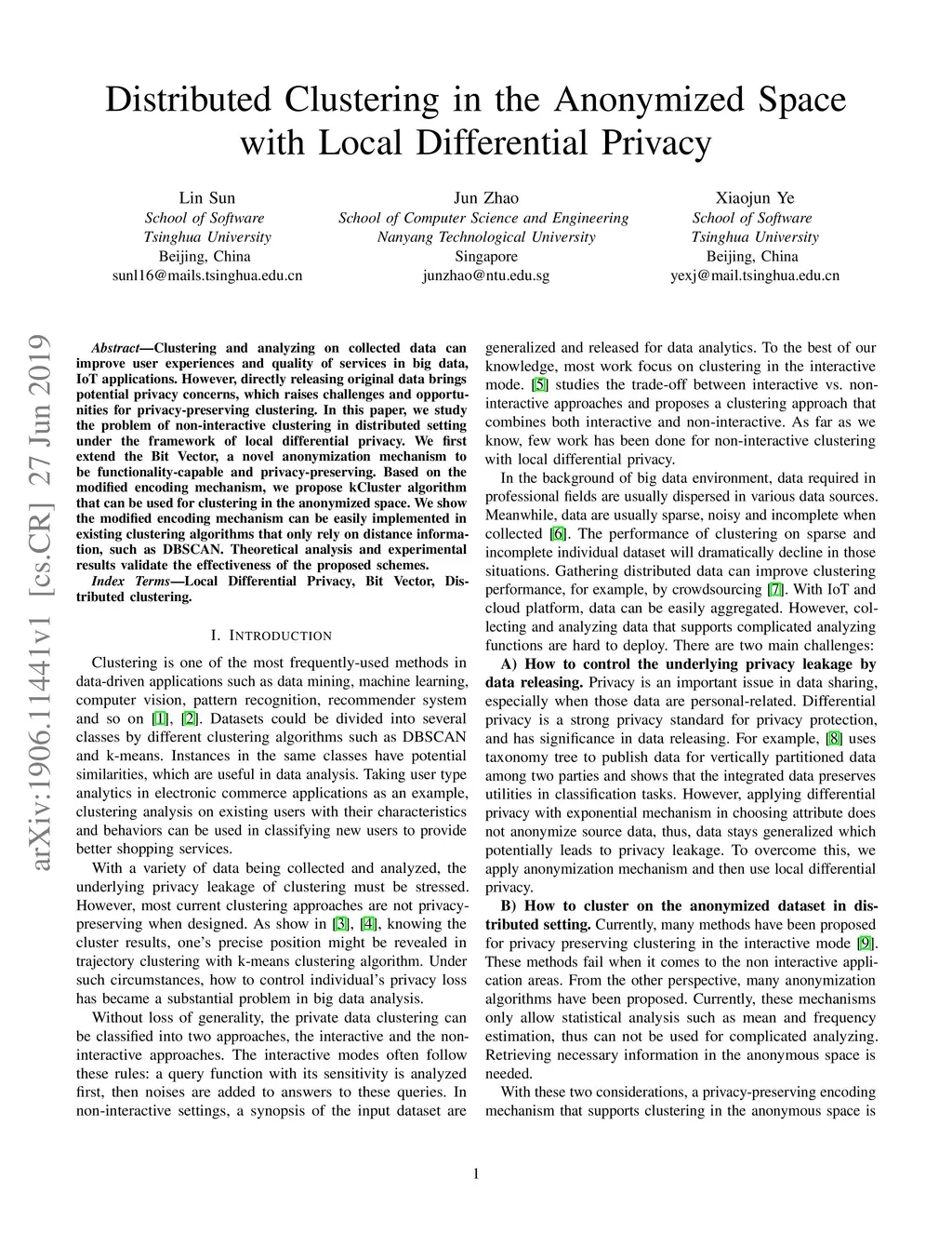 Clustering and analyzing on collected data can improve user experiences and quality of services in big data, IoT applications. However, directly releasing original data brings potential privacy concerns, which raises challenges and opportunities for privacy-preserving clustering. In this paper, we study the problem of non-interactive clustering in distributed setting under the framework of local differential privacy. We first extend the Bit Vector, a novel anonymization mechanism to be functionality-capable and privacy-preserving. Based on the modified encoding mechanism, we propose kCluster algorithm that can be used for clustering in the anonymized space. We show the modified encoding mechanism can be easily implemented in existing clustering algorithms that only rely on distance information, such as DBSCAN. Theoretical analysis and experimental results validate the effectiveness of the proposed schemes.