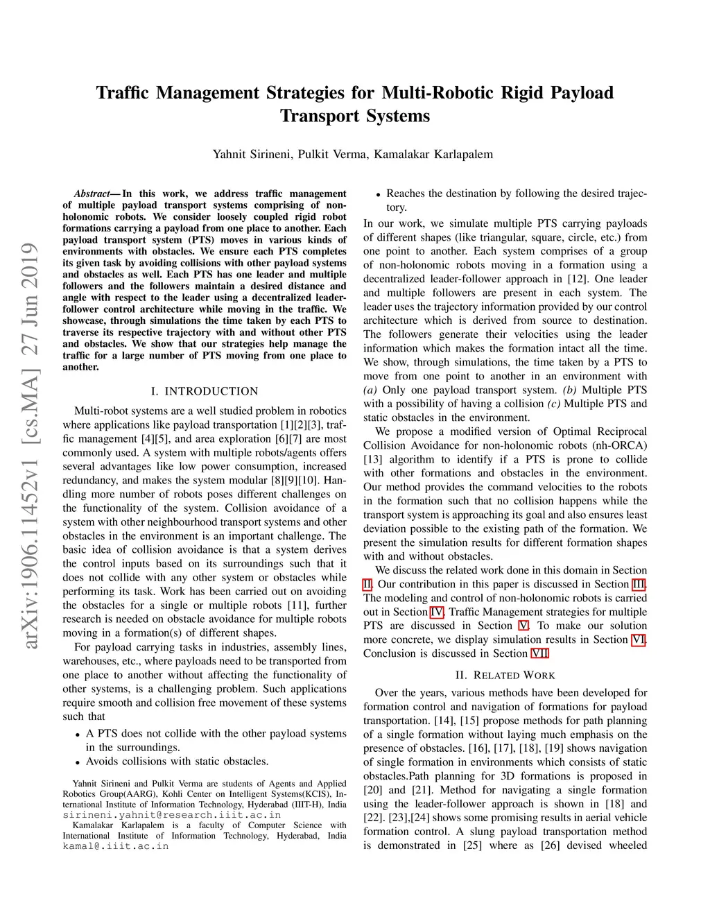 In this work, we address traffic management of multiple payload transport systems comprising of non-holonomic robots. We consider loosely coupled rigid robot formations carrying a payload from one place to another. Each payload transport system (PTS) moves in various kinds of environments with obstacles. We ensure each PTS completes its given task by avoiding collisions with other payload systems and obstacles as well. Each PTS has one leader and multiple followers and the followers maintain a desired distance and angle with respect to the leader using a decentralized leader-follower control architecture while moving in the traffic. We showcase, through simulations the time taken by each PTS to traverse its respective trajectory with and without other PTS and obstacles. We show that our strategies help manage the traffic for a large number of PTS moving from one place to another.