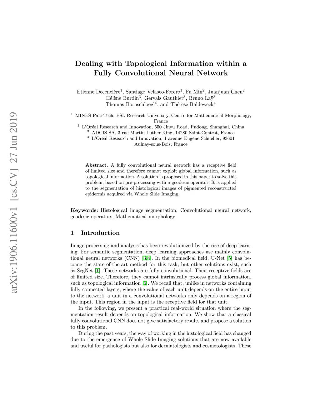 A fully convolutional neural network has a receptive field of limited size and therefore cannot exploit global information, such as topological information. A solution is proposed in this paper to solve this problem, based on pre-processing with a geodesic operator. It is applied to the segmentation of histological images of pigmented reconstructed epidermis acquired via Whole Slide Imaging.