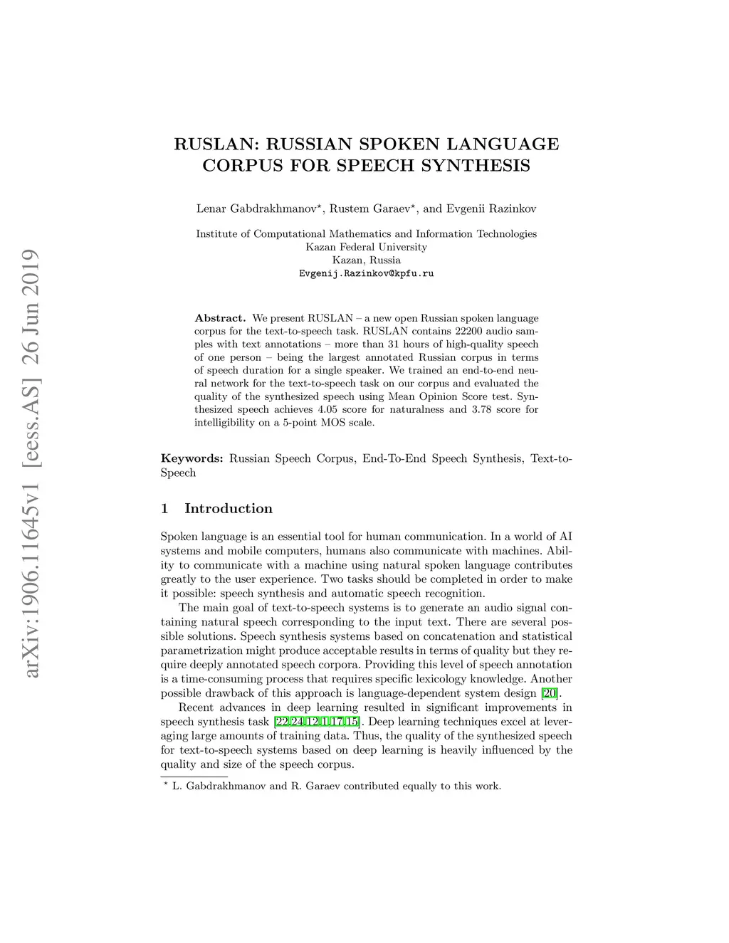 RUSLAN: Russian Spoken Language Corpus for Speech Synthesis