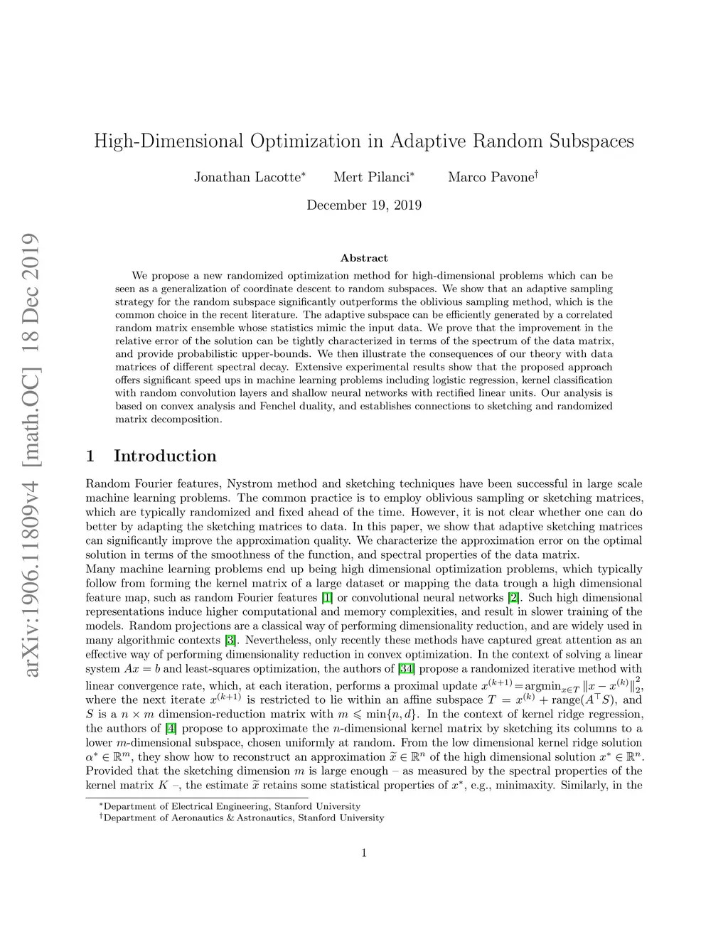 We propose a new randomized optimization method for high-dimensional problems which can be seen as a generalization of coordinate descent to random subspaces. We show that an adaptive sampling strategy for the random subspace significantly outperforms the oblivious sampling method, which is the common choice in the recent literature. The adaptive subspace can be efficiently generated by a correlated random matrix ensemble whose statistics mimic the input data. We prove that the improvement in the relative error of the solution can be tightly characterized in terms of the spectrum of the data matrix, and provide probabilistic upper-bounds. We then illustrate the consequences of our theory with data matrices of different spectral decay. Extensive experimental results show that the proposed approach offers significant speed ups in machine learning problems including logistic regression, kernel classification with random convolution layers and shallow neural networks with rectified linear units. Our analysis is based on convex analysis and Fenchel duality, and establishes connections to sketching and randomized matrix decomposition.